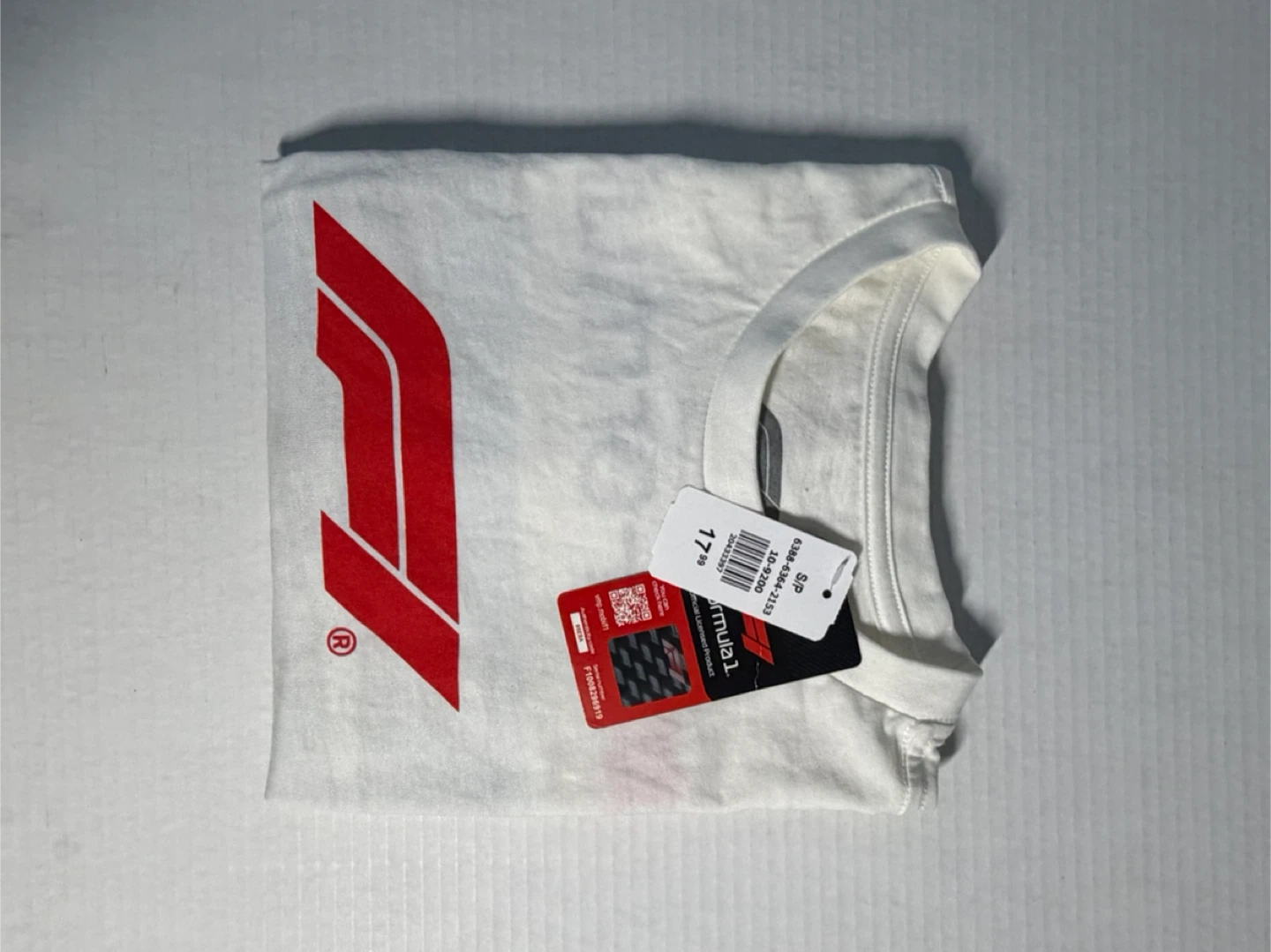 White t-shirt with Formula 1 graphics, featuring a race car schematic and track design. 100% cotton material. Size SP (Small).