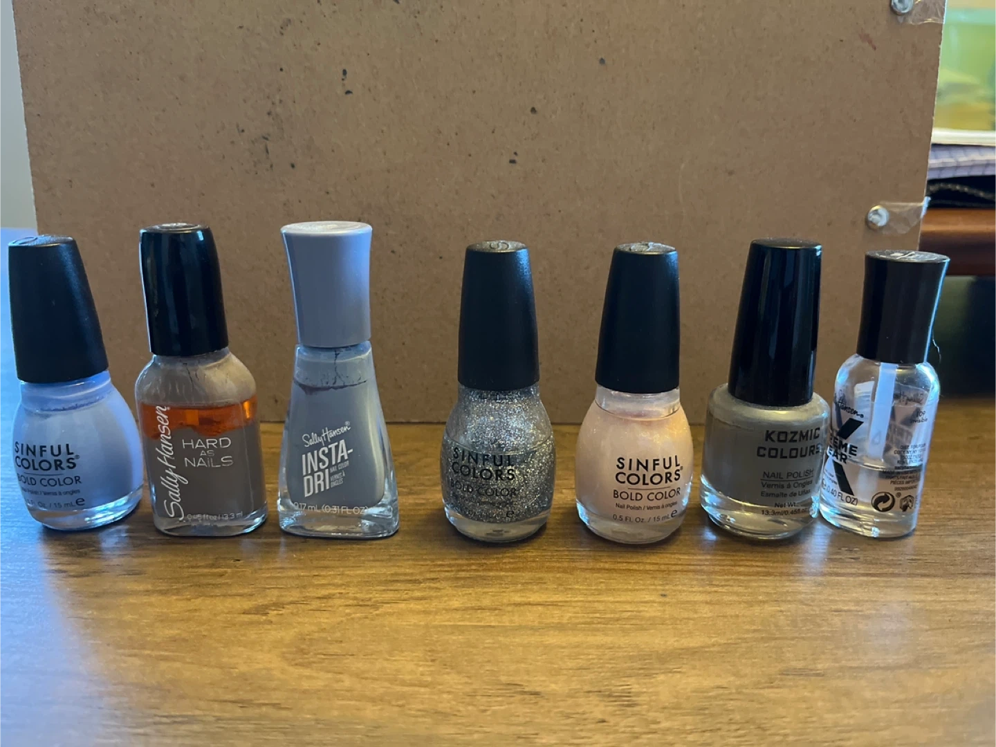 This lot includes various shades of nail polish from Sally Hansen and Sinful Colors. You'll get 7 bottles in total, featuring different finishes and colours. These polishes are great for at-home manicures or trying out new looks!