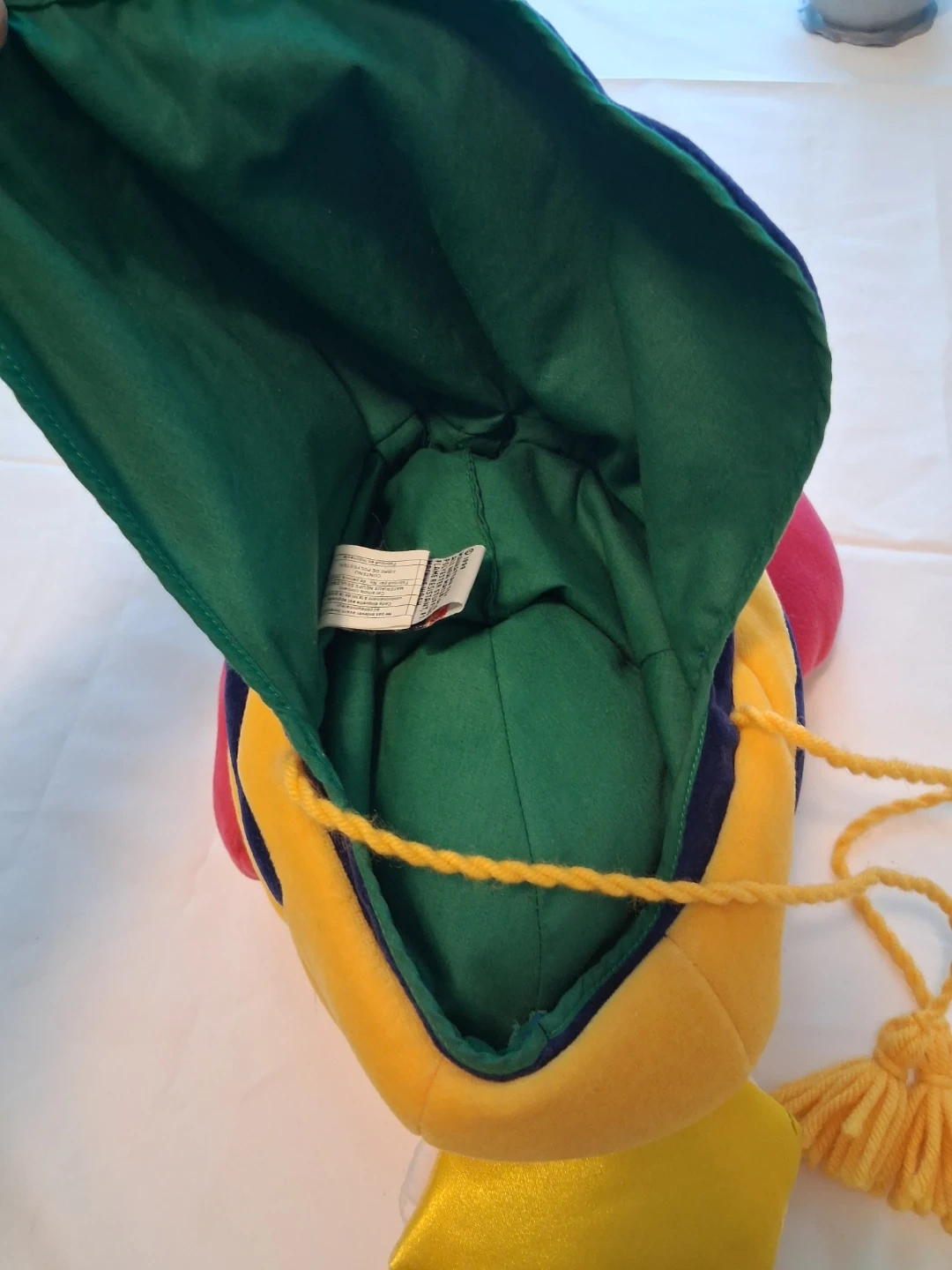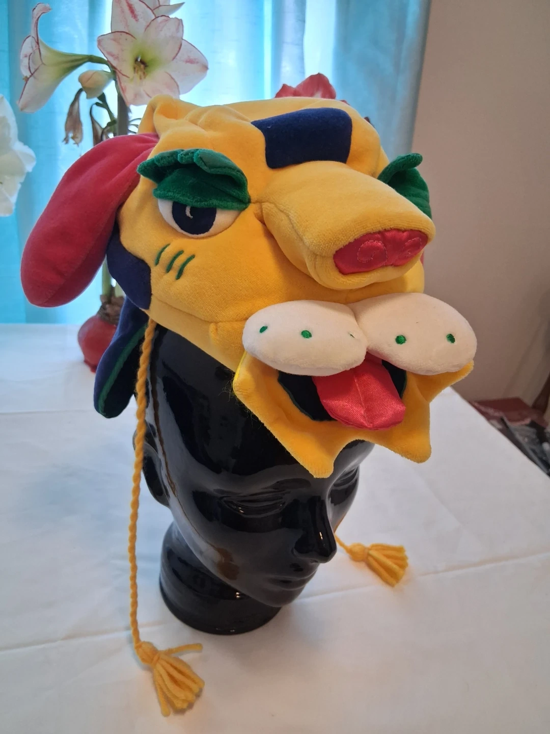 This fun, plush animal hat is from Manhattan Toy. It's yellow with red, blue, and green accents. Features ear flaps and ties with tassels.