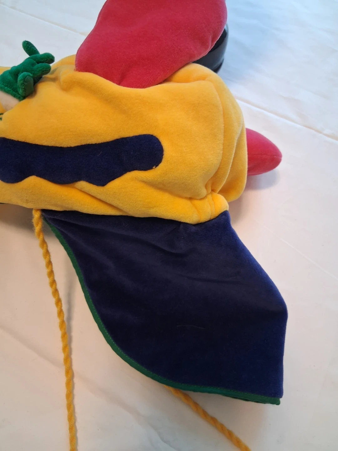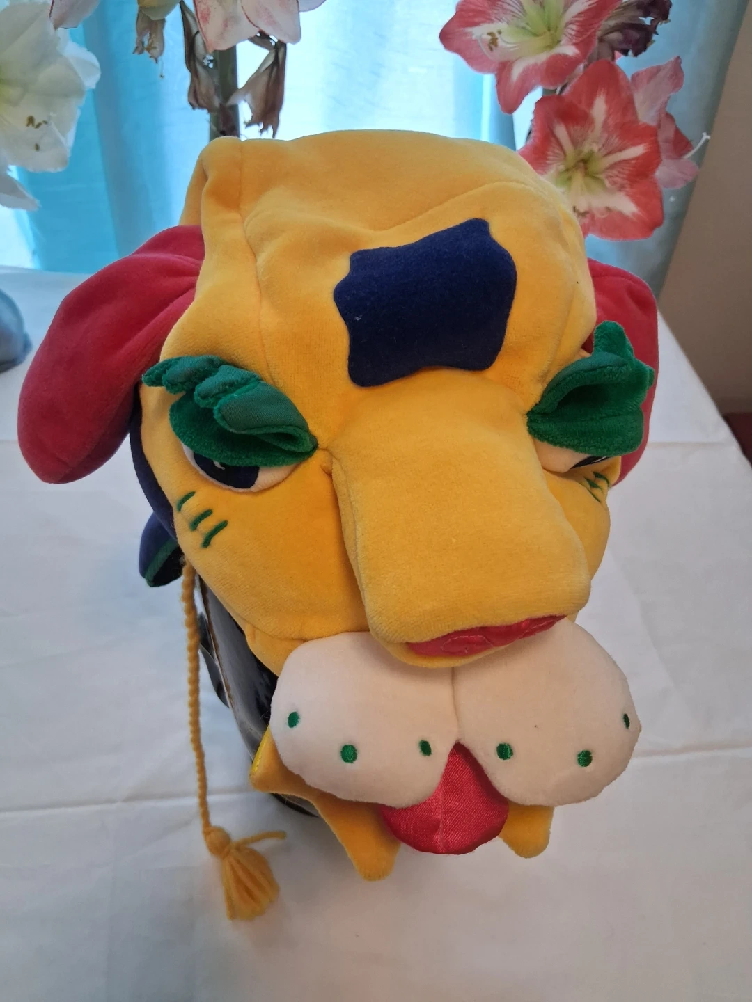 This fun, plush animal hat is from Manhattan Toy. It's yellow with red, blue, and green accents. Features ear flaps and ties with tassels.