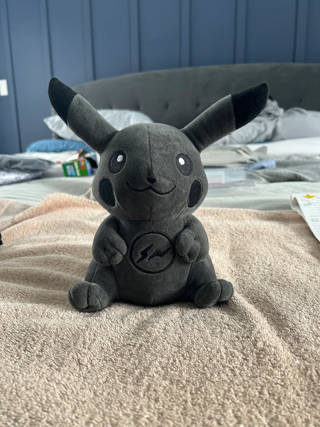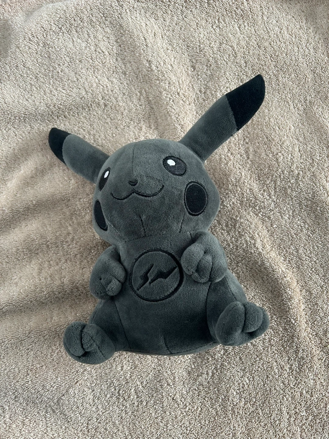 This is a grey Pikachu plush toy. It's made of soft material and features the iconic lightning bolt emblem on its chest. It's a fun collectible for any Pokémon fan!