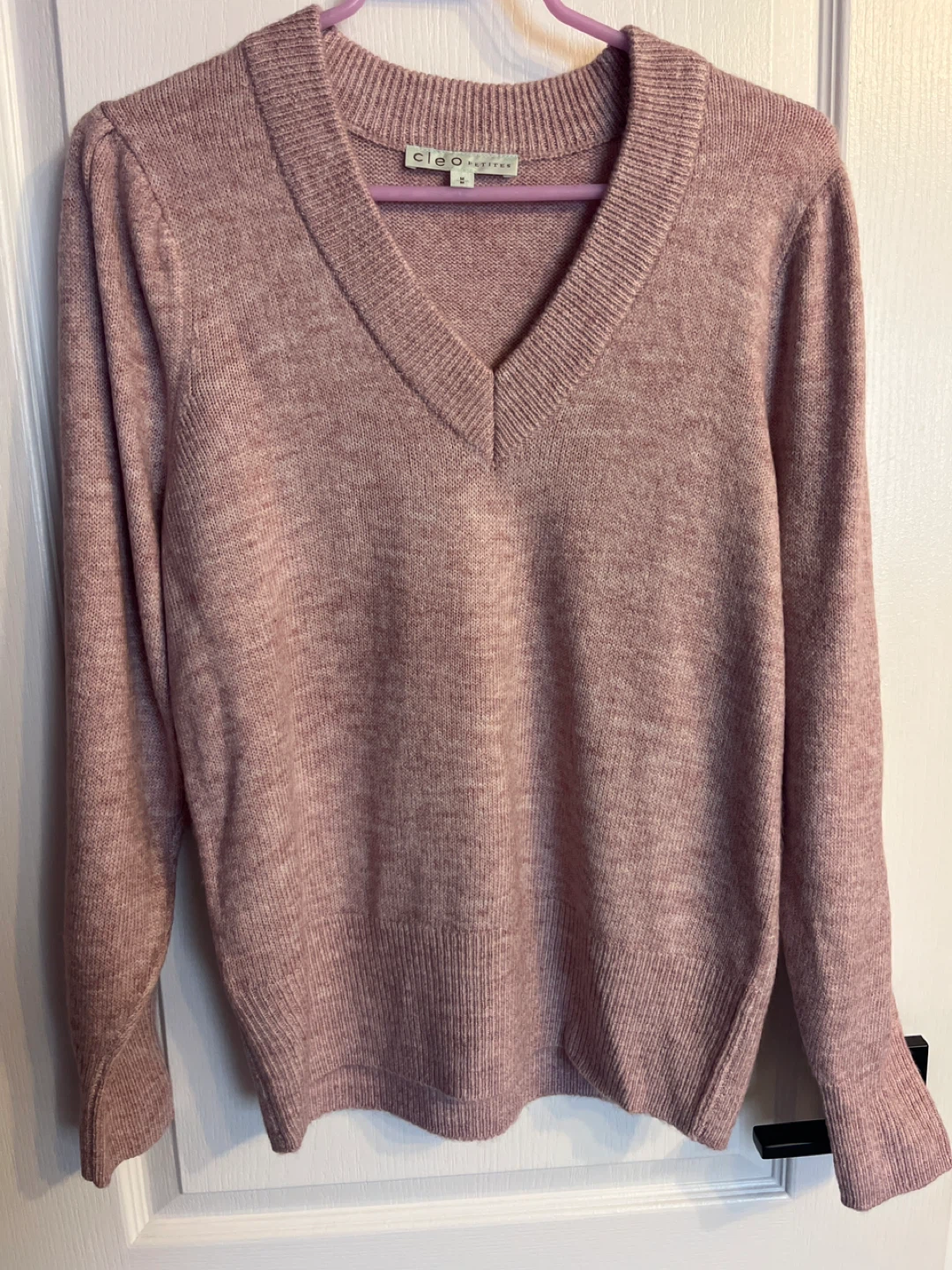 A lovely pink V-neck sweater from Cleo Petites! It's a size medium and in great condition. Perfect for layering or wearing on its own. Pet and smoke free home. Pick up in Stittsville.