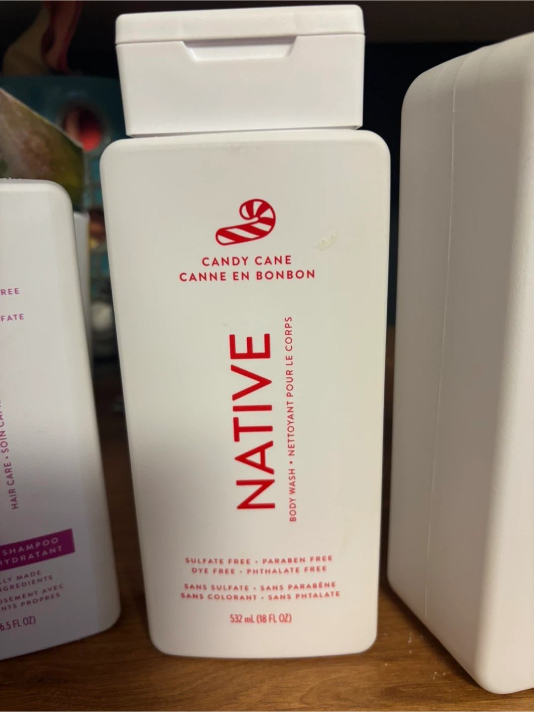 Native body wash in Candy Cane scent. It's sulfate free, paraben free, dye free, and phthalate free. Comes in a 532 ml (18 FL OZ) bottle.