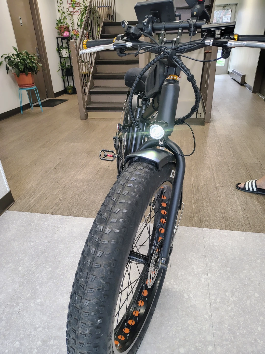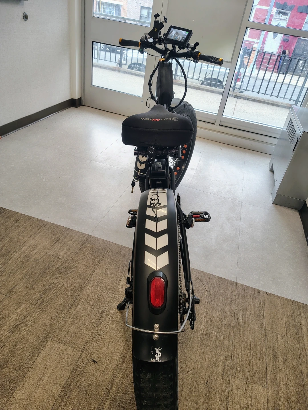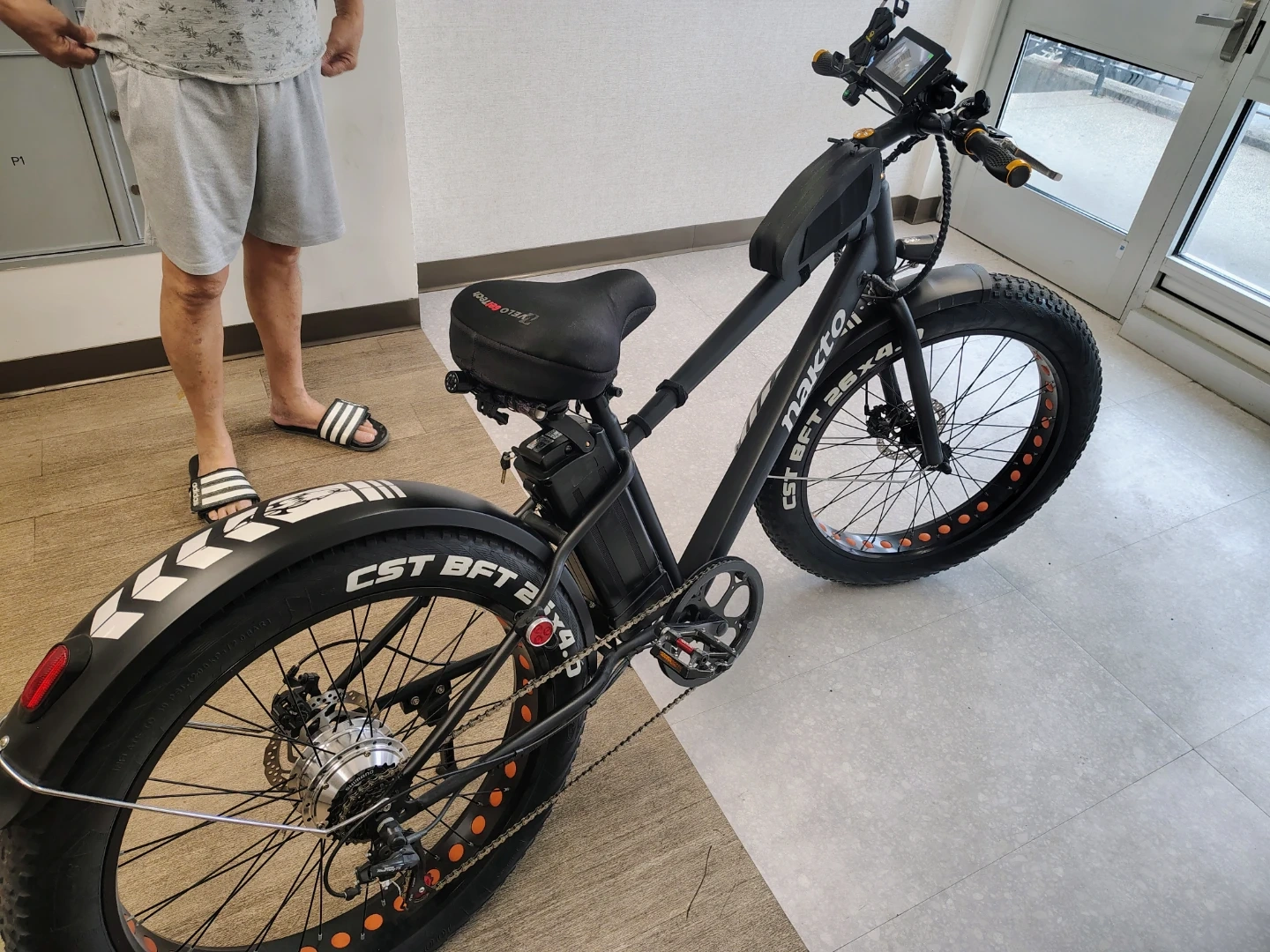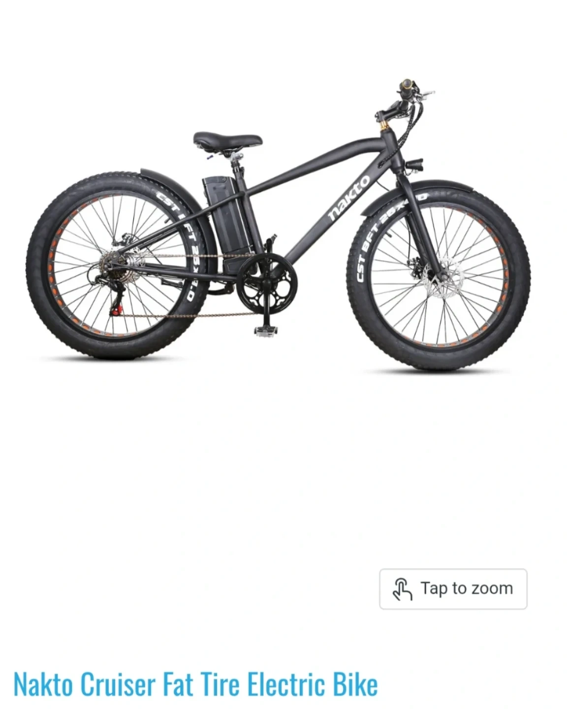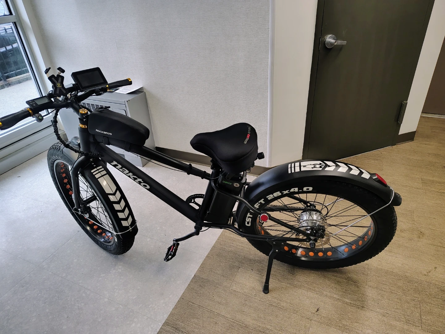 NAKTO fat tire electric bike. Features a digital display showing speed and battery life. Includes a front headlight and a saddle bag. Fat tires offer a smooth ride. For $1000