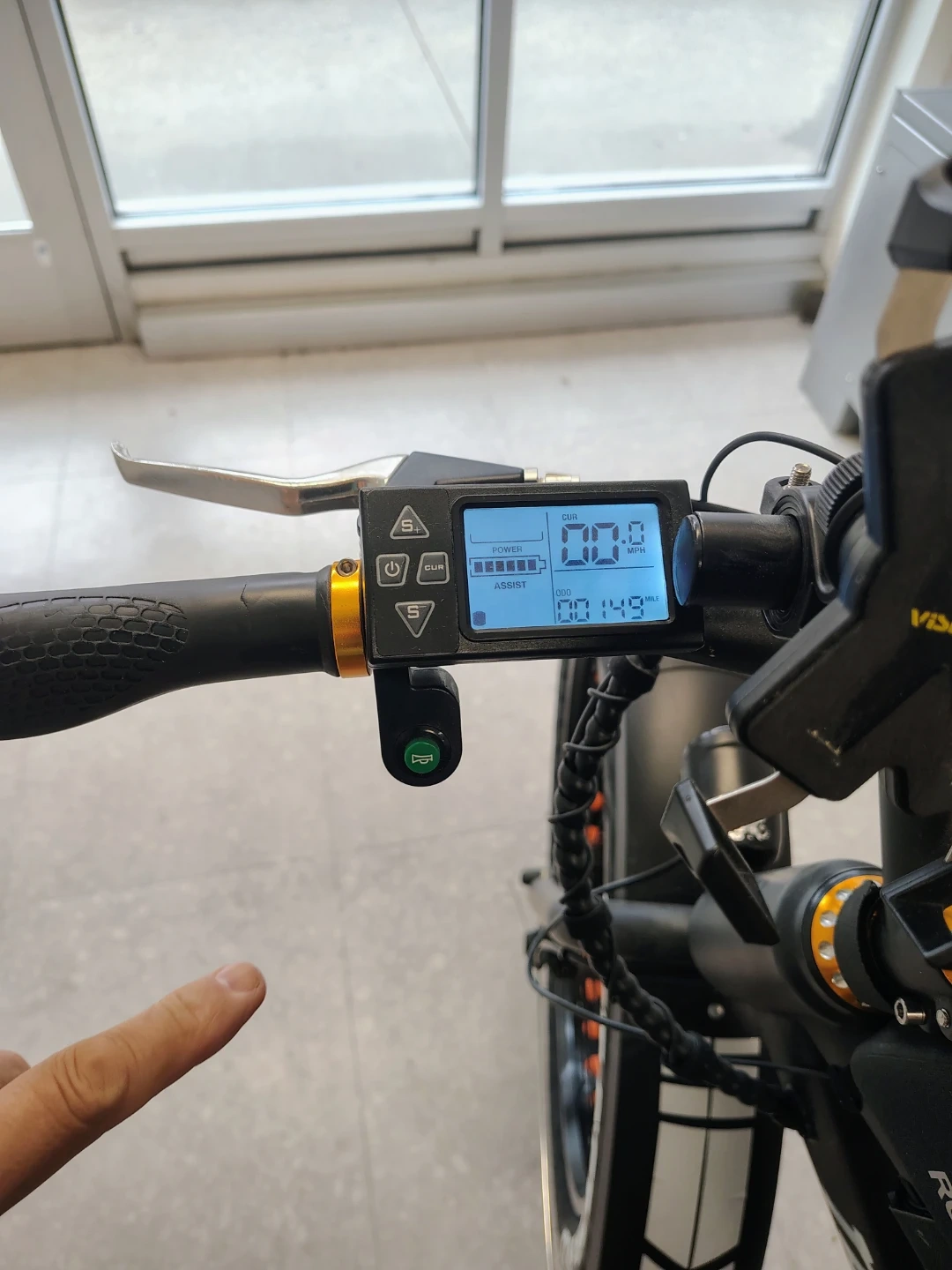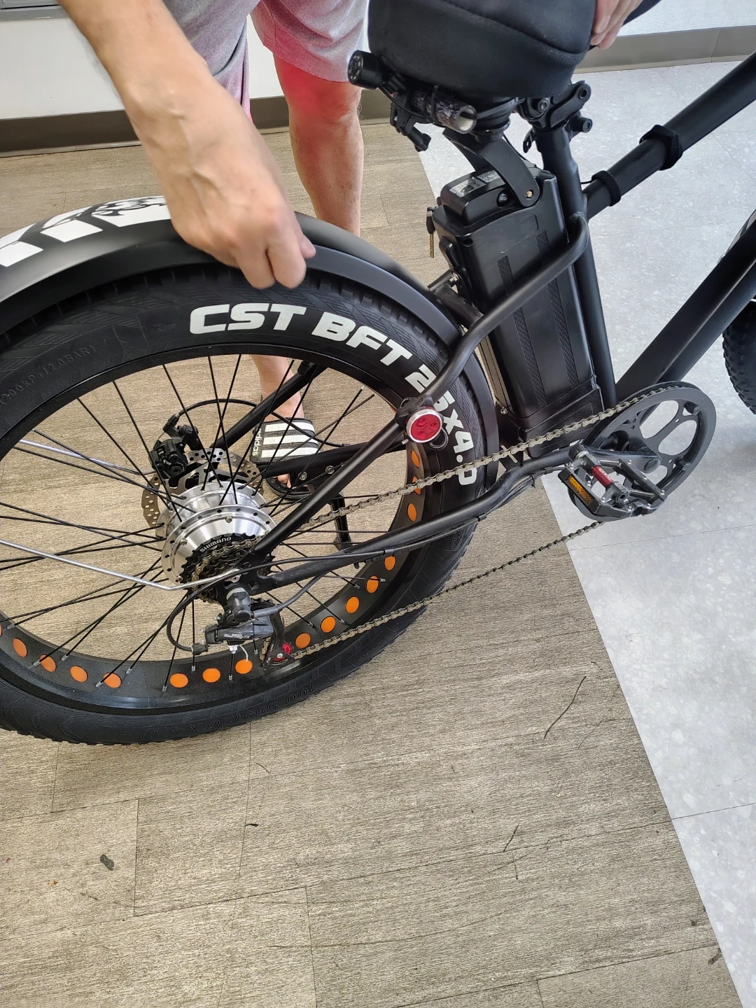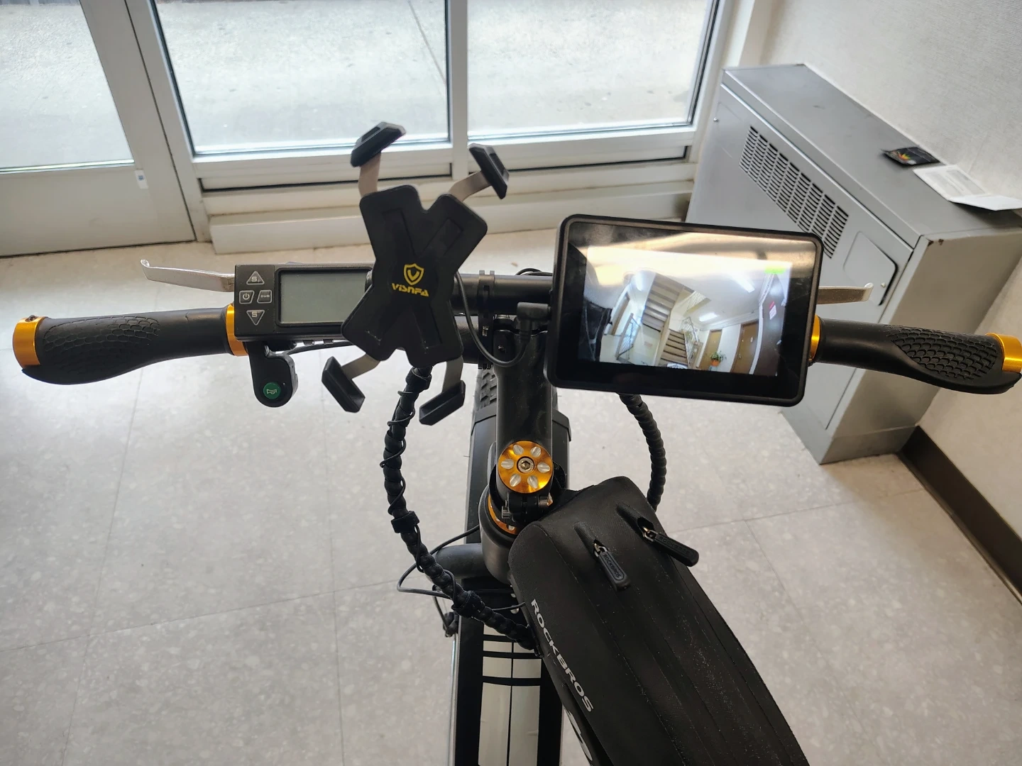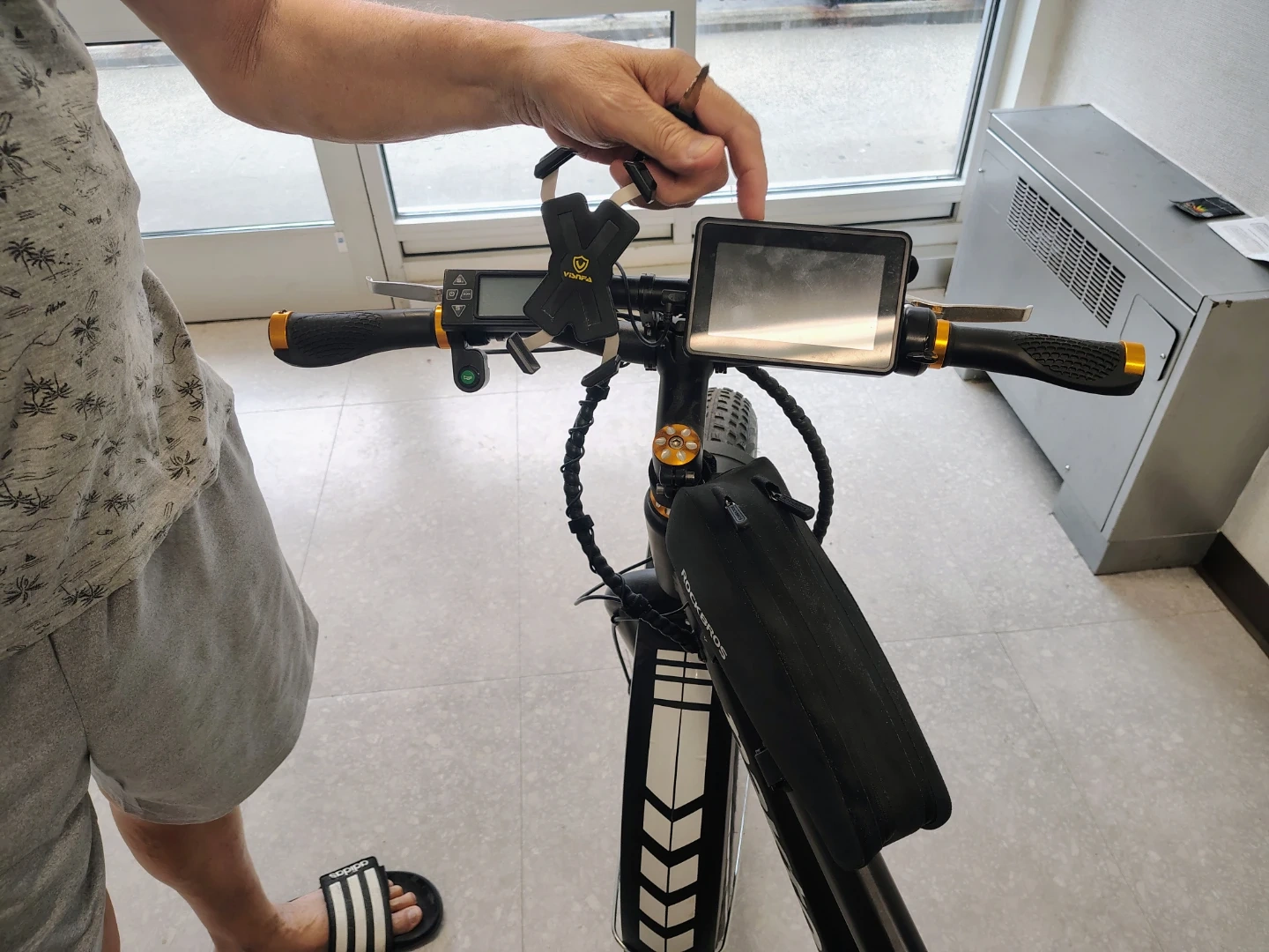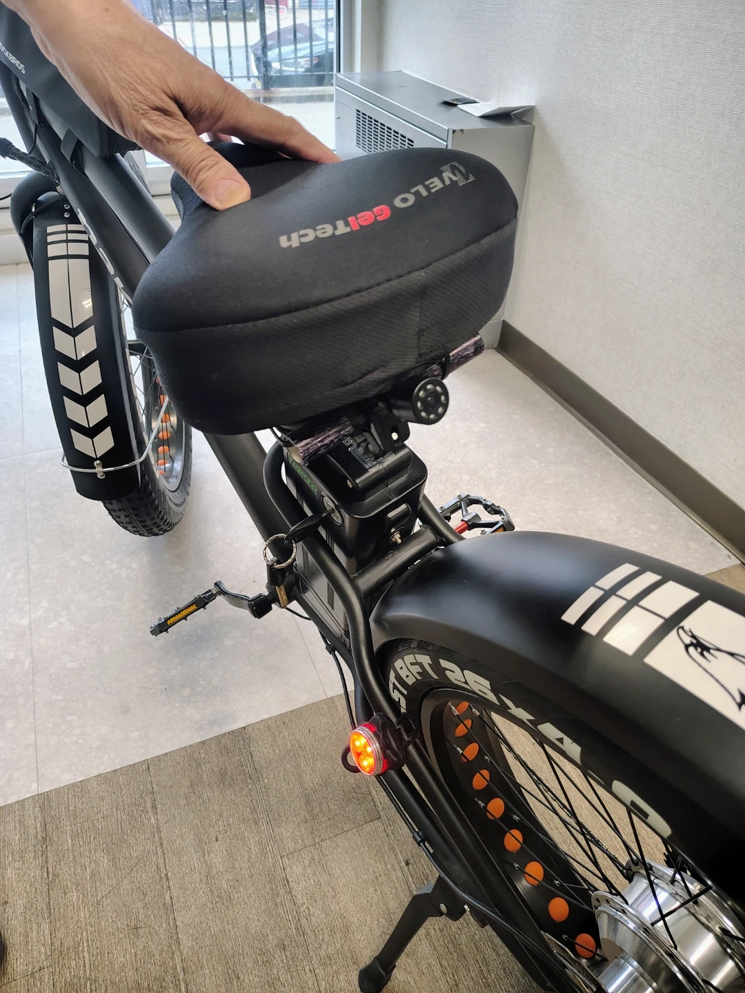 NAKTO fat tire electric bike. Features a digital display showing speed and battery life. Includes a front headlight and a saddle bag. Fat tires offer a smooth ride. For $1000