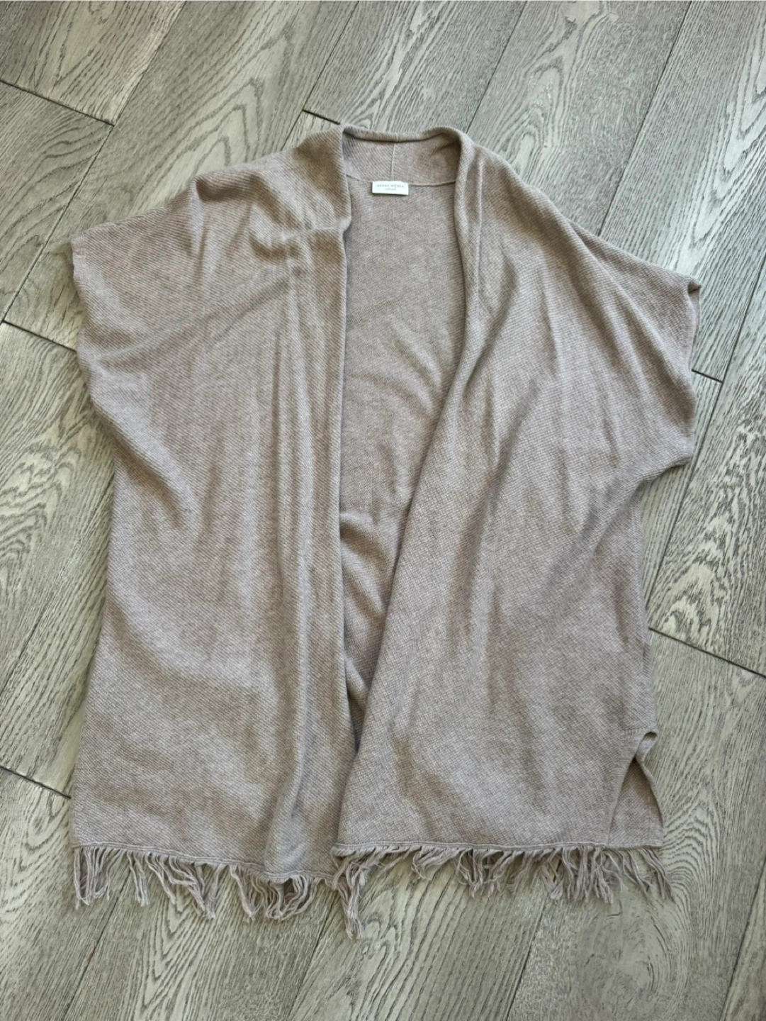 features a relaxed fit and delicate fringe detailing at the hem. This versatile piece is perfect for layering and adds a touch of elegance to any outfit.