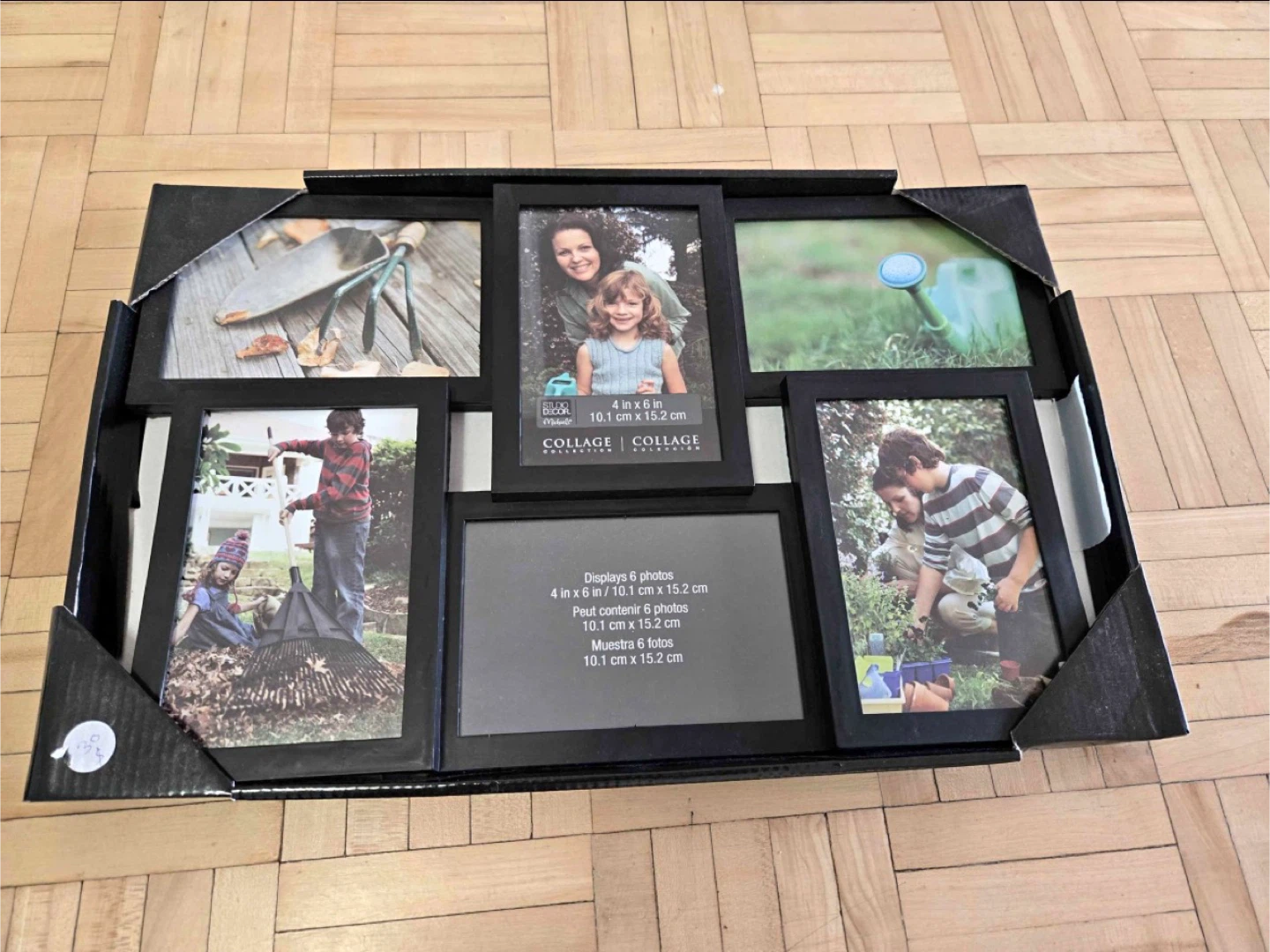 - One collage frame that displays 6 photos (4 in x 6 in / 10.1 cm x 15.2 cm)- 15$