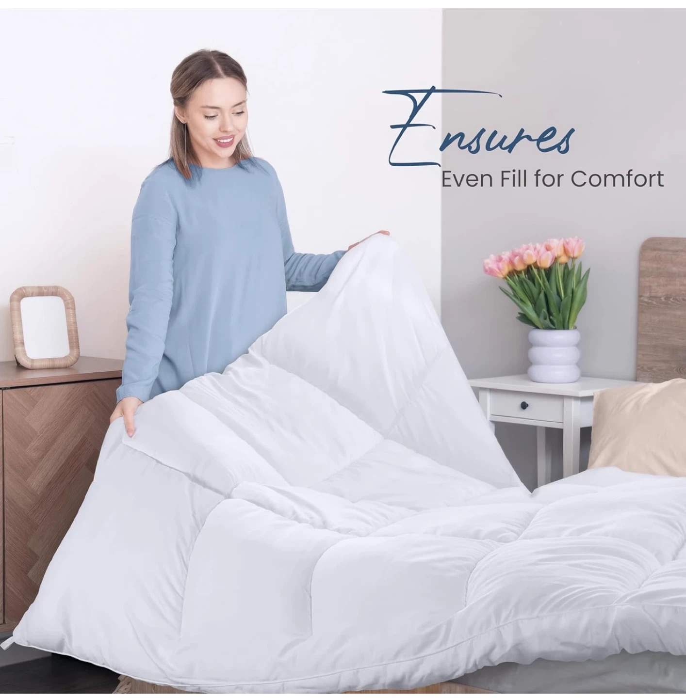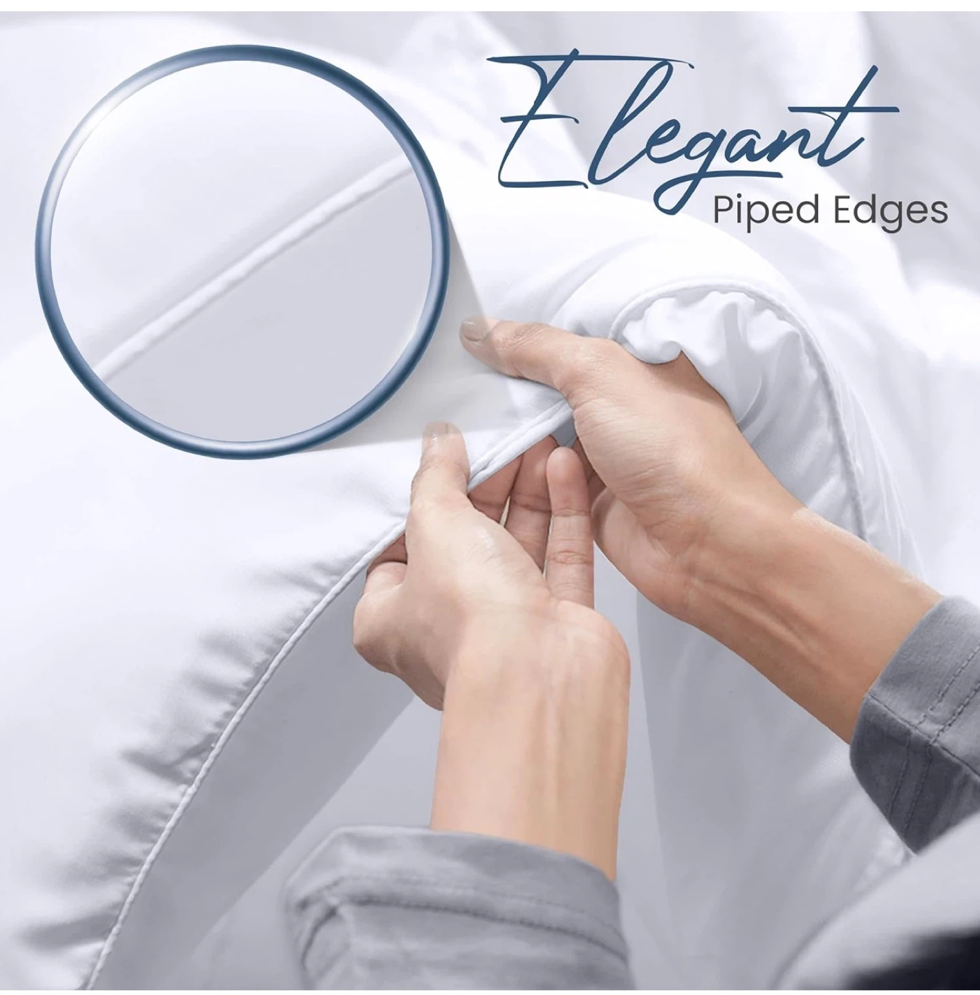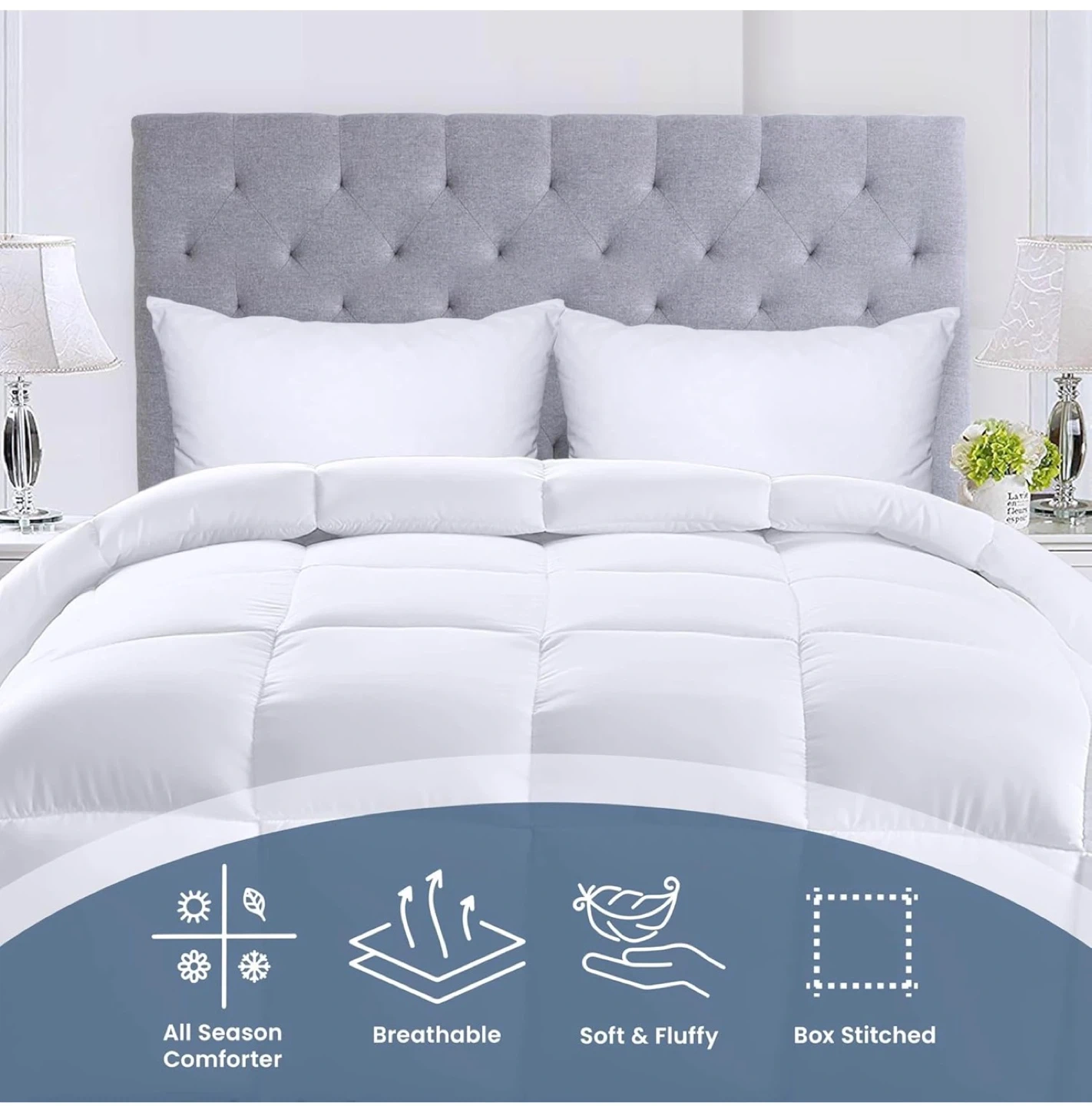 Looking to keep cozy all year round? This Elegant white comforter is soft, fluffy, and breathable, perfect for all seasons! It features a box-stitched design to ensure even fill for comfort and convenient corner tabs. The piped edges add an elegant touch to your bedroom decor.