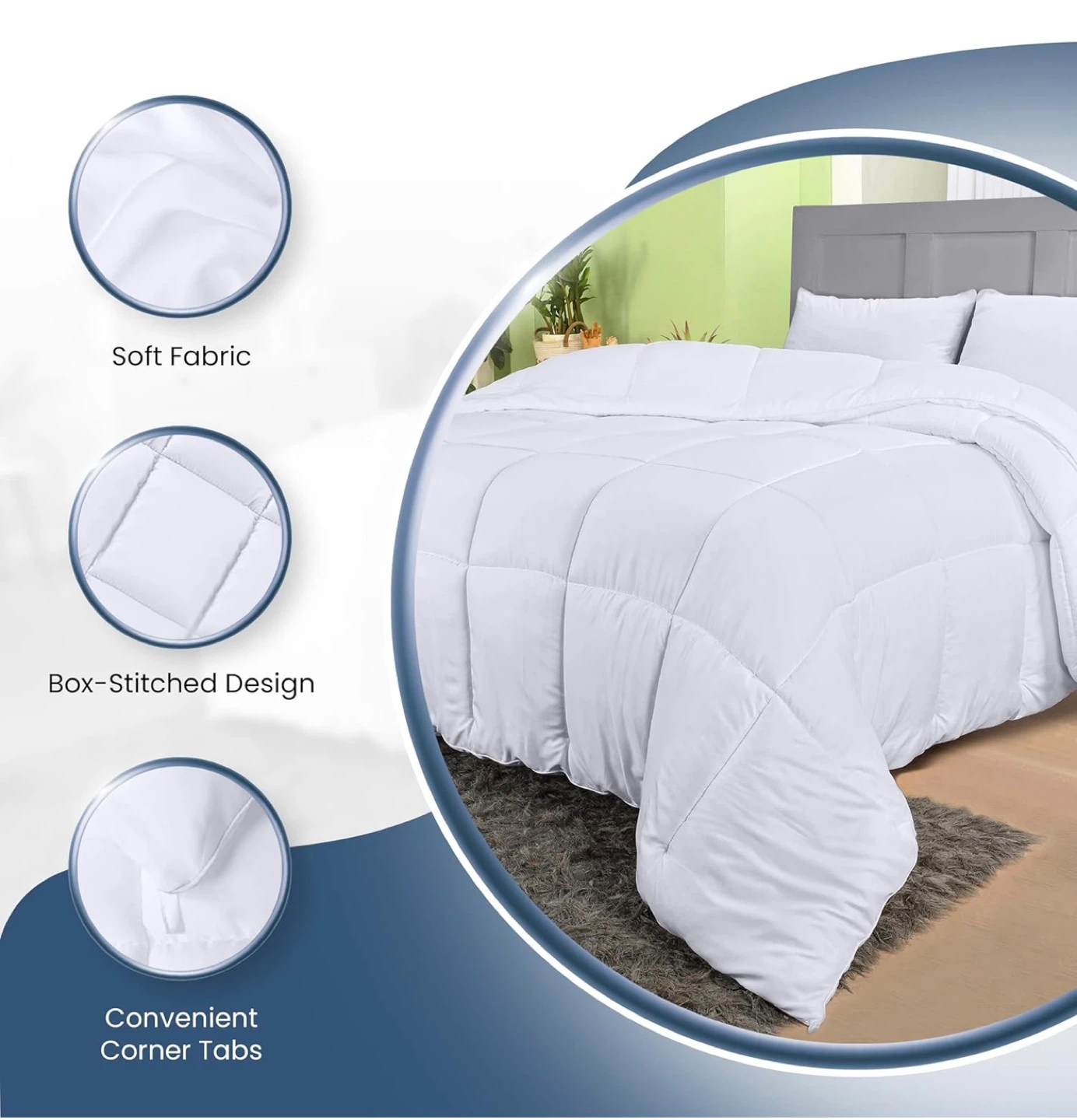 Looking to keep cozy all year round? This Elegant white comforter is soft, fluffy, and breathable, perfect for all seasons! It features a box-stitched design to ensure even fill for comfort and convenient corner tabs. The piped edges add an elegant touch to your bedroom decor.