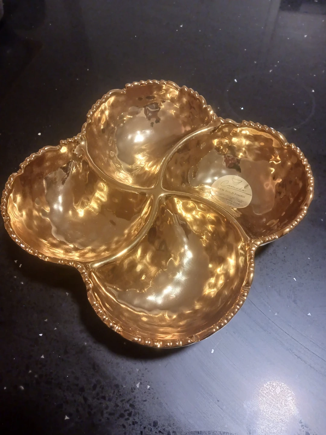 Here's a beautiful Camila serving dish with a gold finish! It's perfect for serving snacks or appetizers at your next gathering. The dish is divided into four sections, making it easy to keep different items separate. It would be a lovely addition to any table setting good gift π§§ π