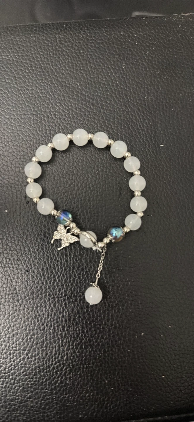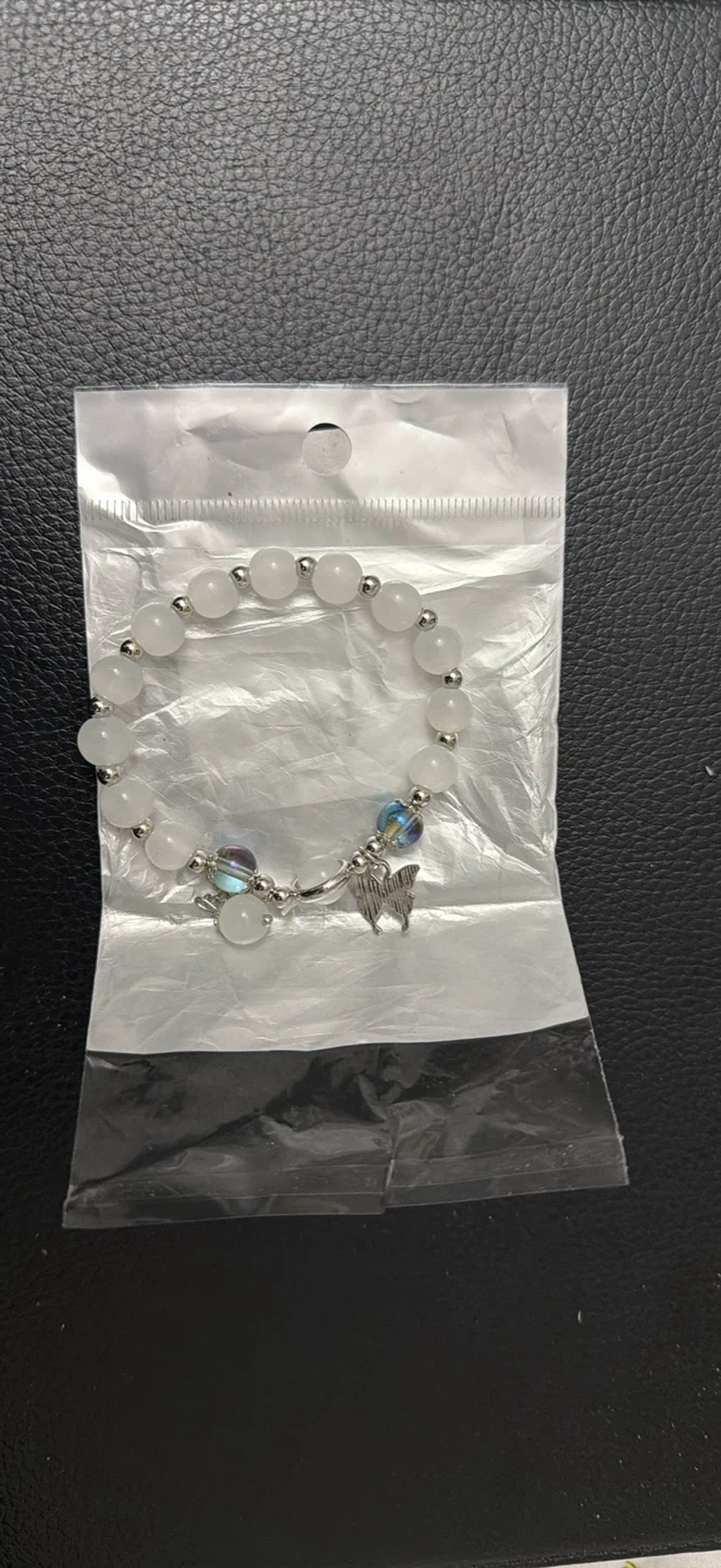 Here's a cute white beaded bracelet! It has a charm and is in new condition, still in its original packaging