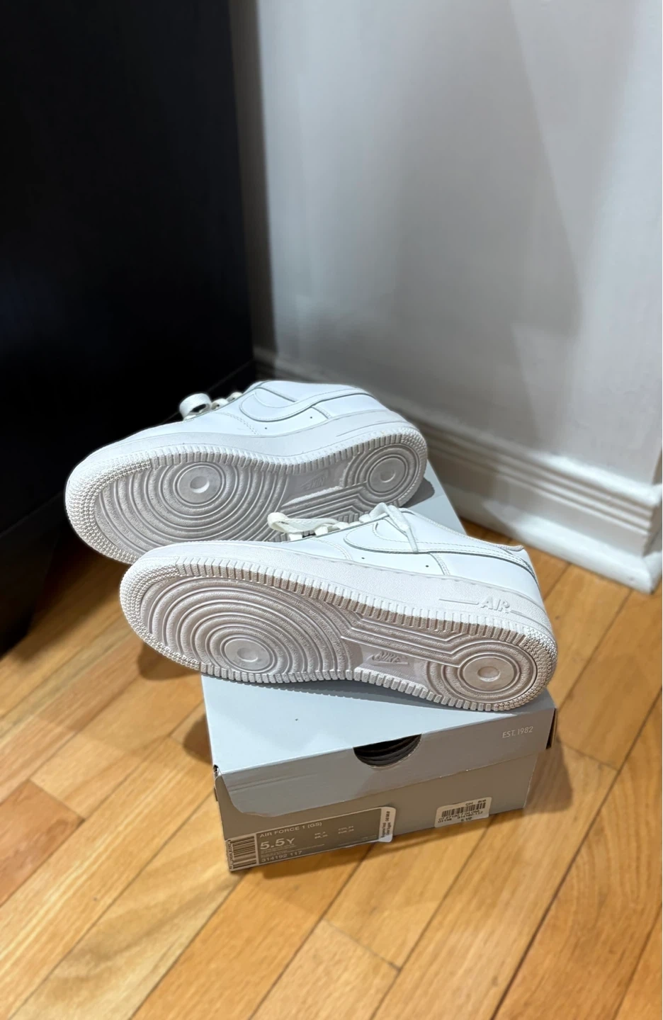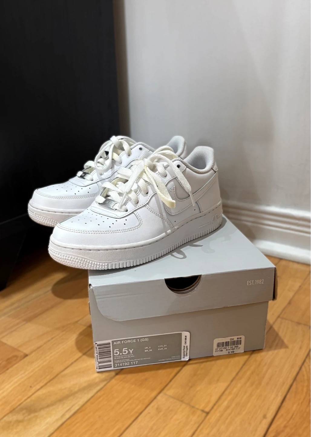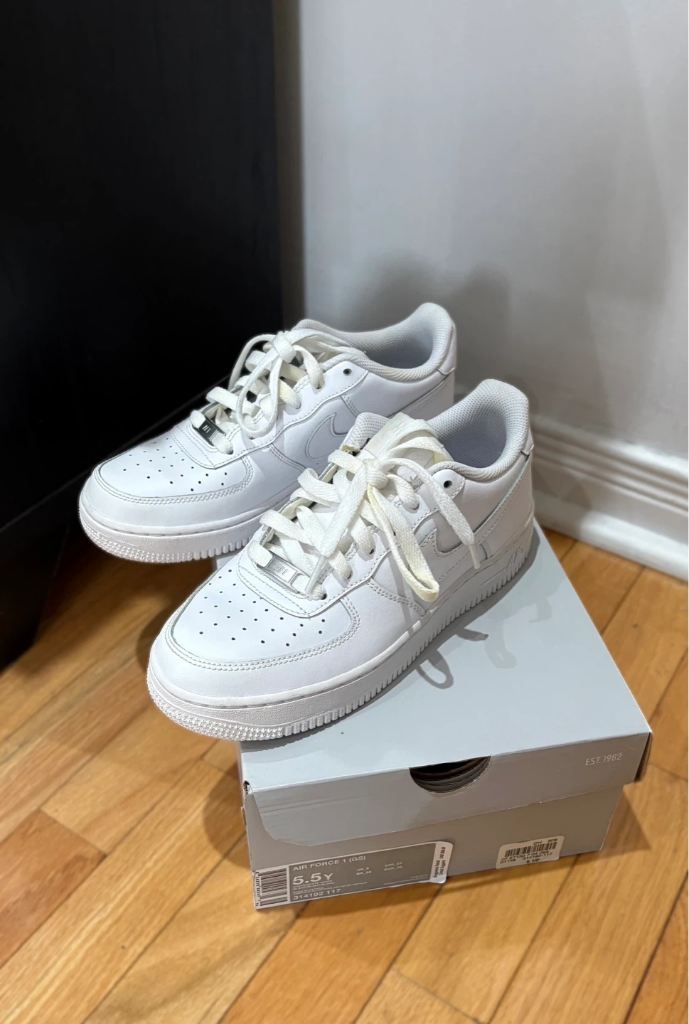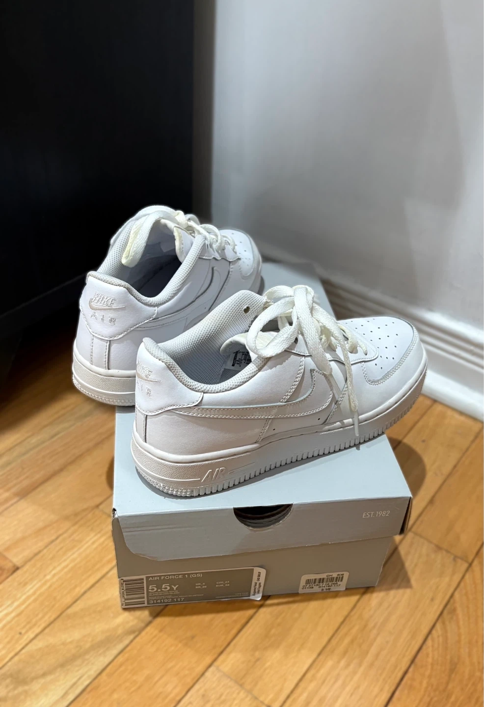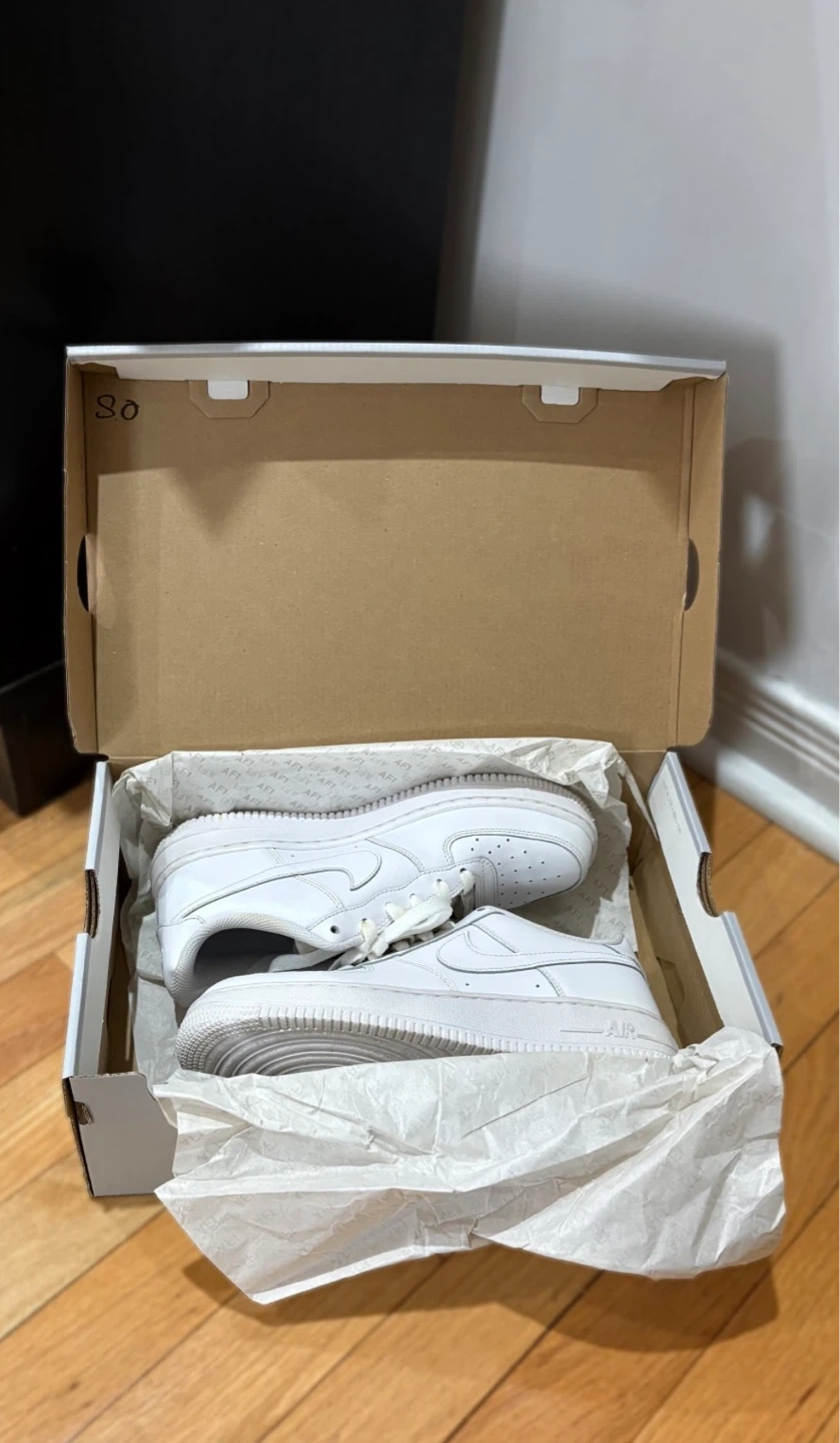 Classic white Nike Air Force 1 sneakers in youth size 5.5Y. Also equivalent to women’s size 7-7.5.
