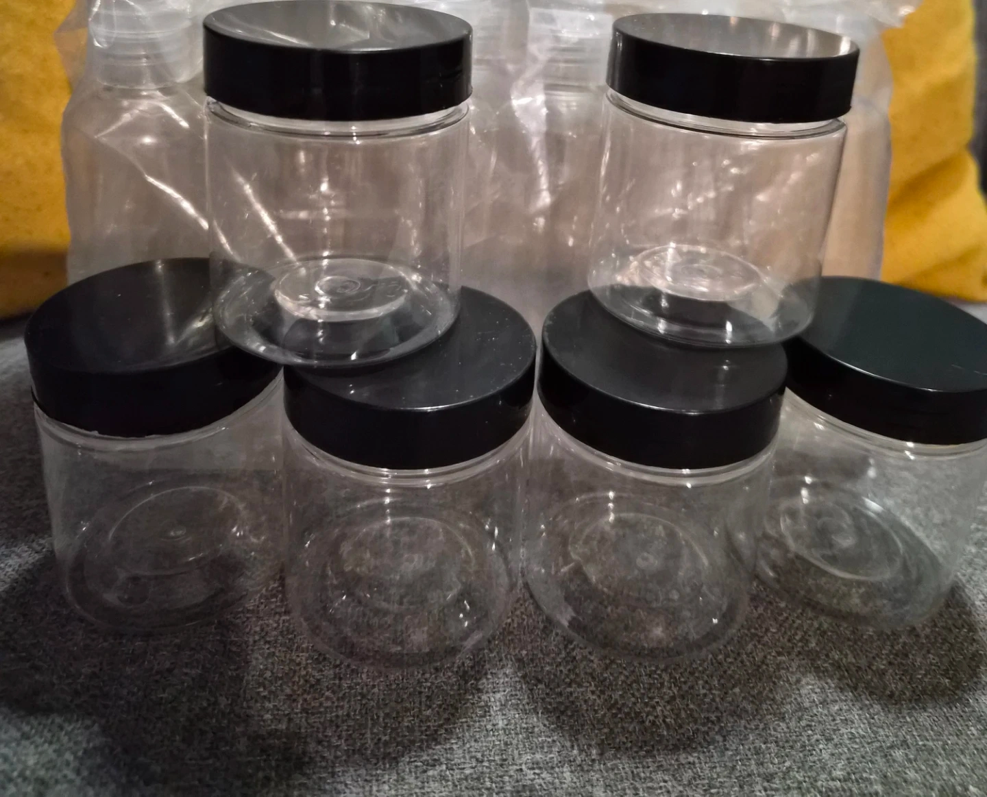 This is a set of six clear plastic jars with black screw-on lids. They're useful for storing small items like craft supplies, cosmetics, or spices. The jars are made of transparent plastic.