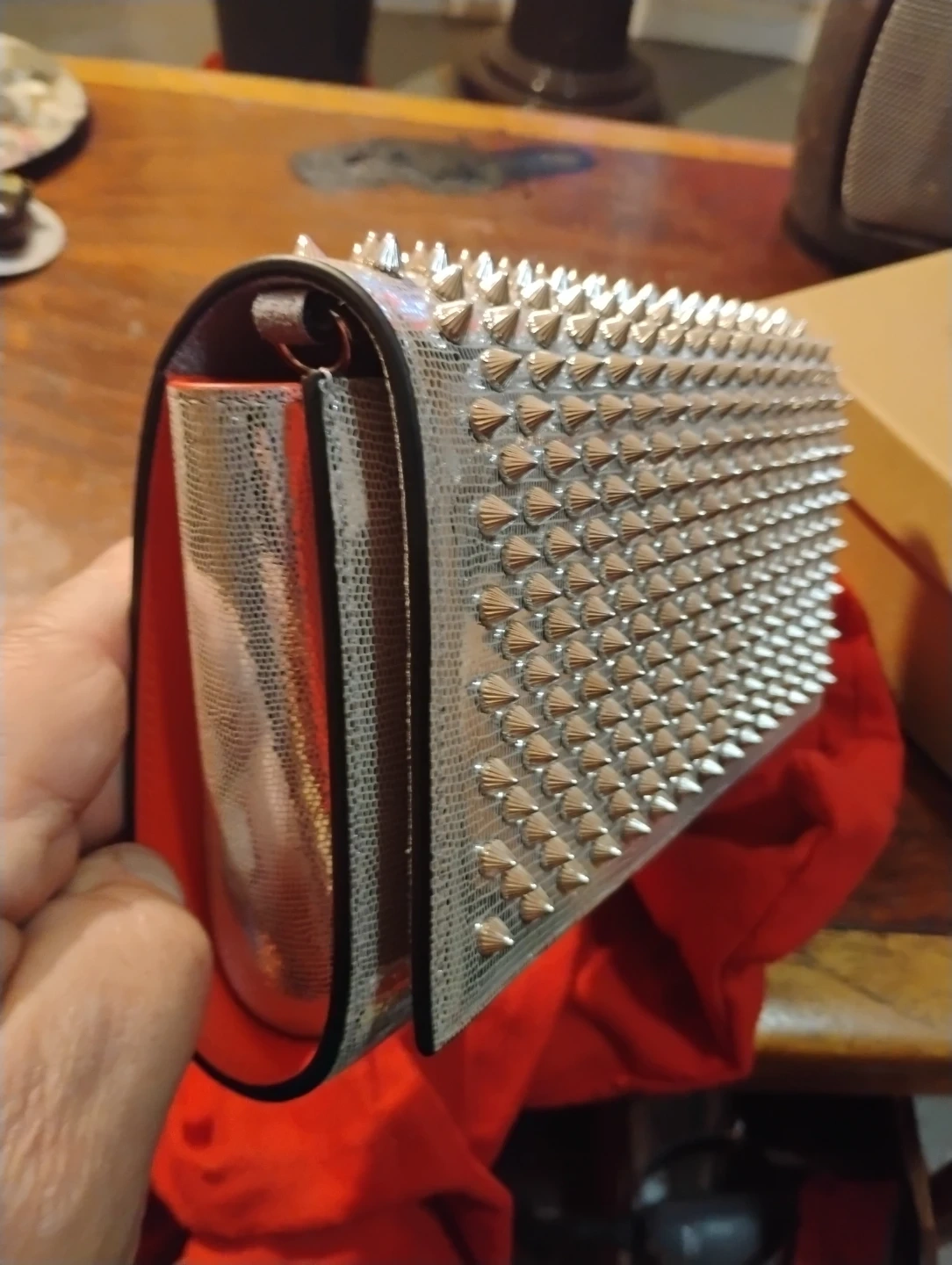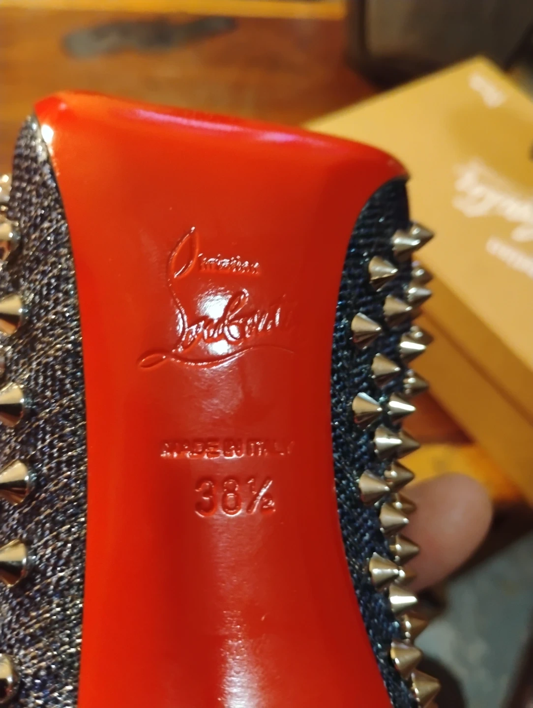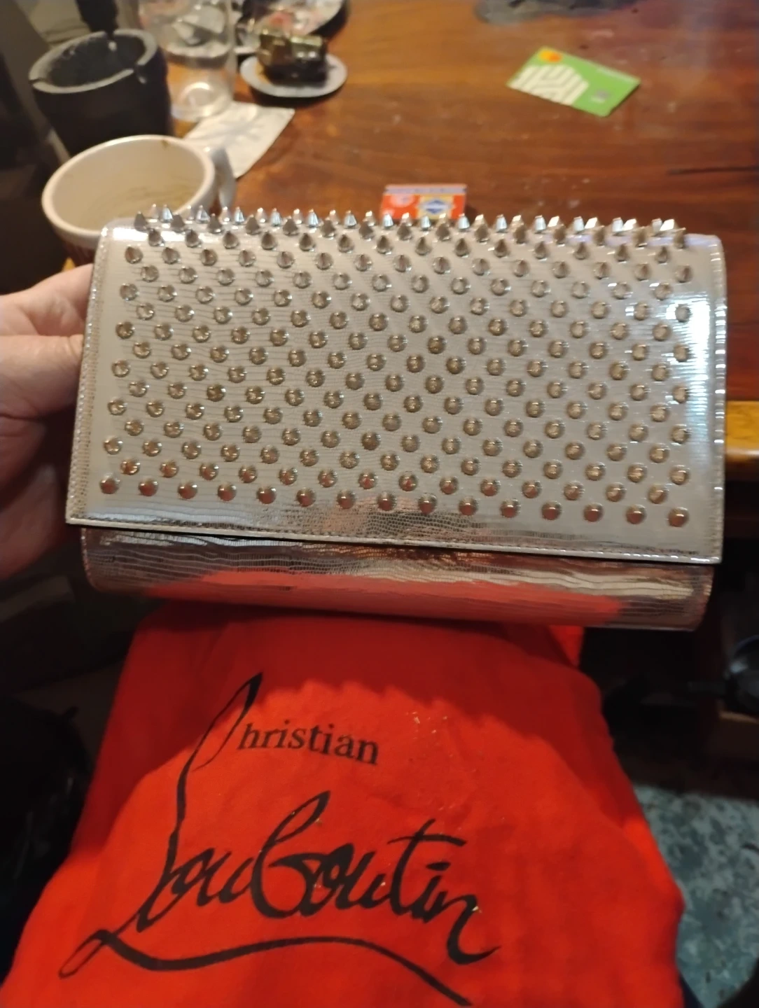 Iconic Christian Louboutin heels and matching clutch, both featuring signature spikes. Shoes are denim with gold spikes and a red sole. Made in Italy. Size 8 1/2.Or 35.8 European size Make offer.