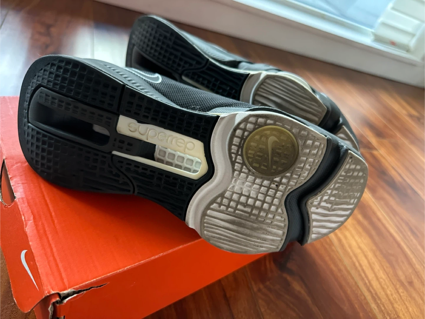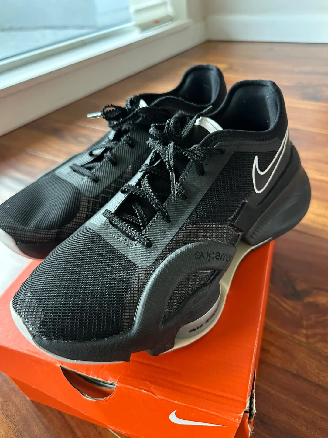 These are Nike SuperRep Go 3 Flyknit training shoes in black. They feature a mesh upper and a durable rubber sole. This footwear is designed for a variety of training activities. Like new, worn only once.