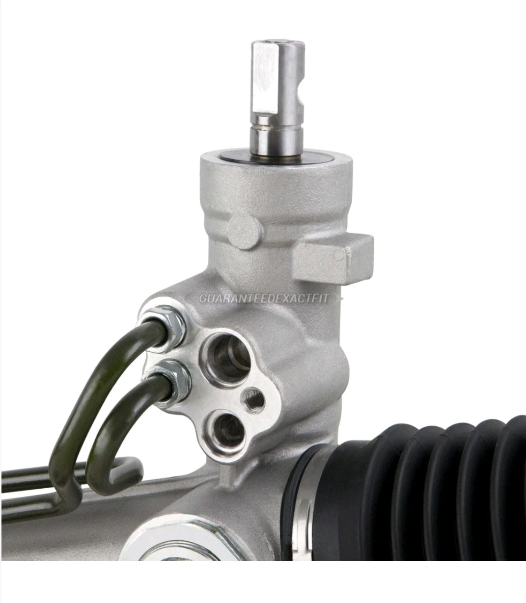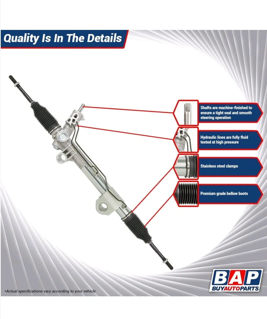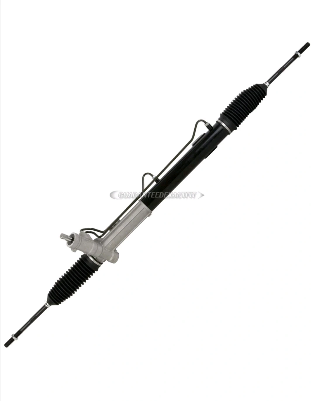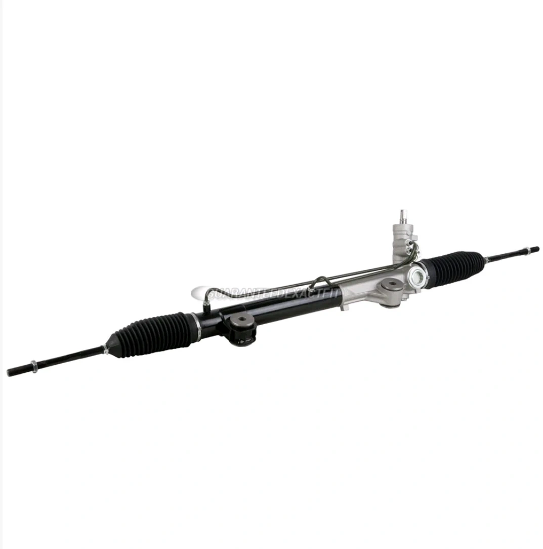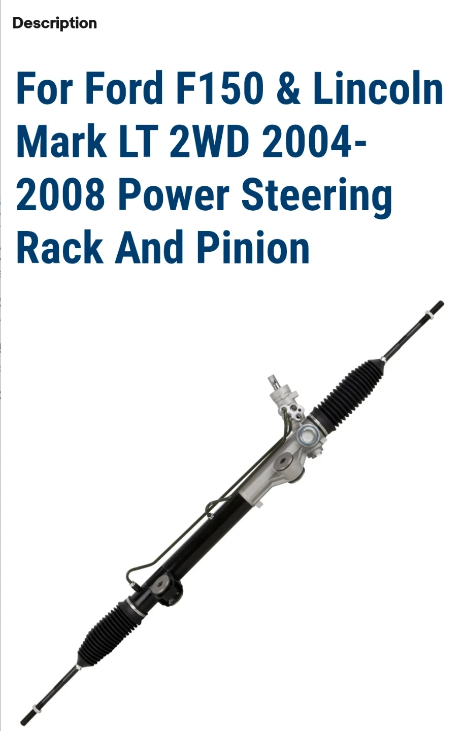 This is a power steering rack and pinion assembly designed for 2WD Ford F150 and Lincoln Mark LT vehicles from 2004-2008. It features machine-finished shafts for a tight seal and smooth operation. Hydraulic lines are fully fluid tested at high pressure. It includes premium grade bellow boots and stainless steel clamps.