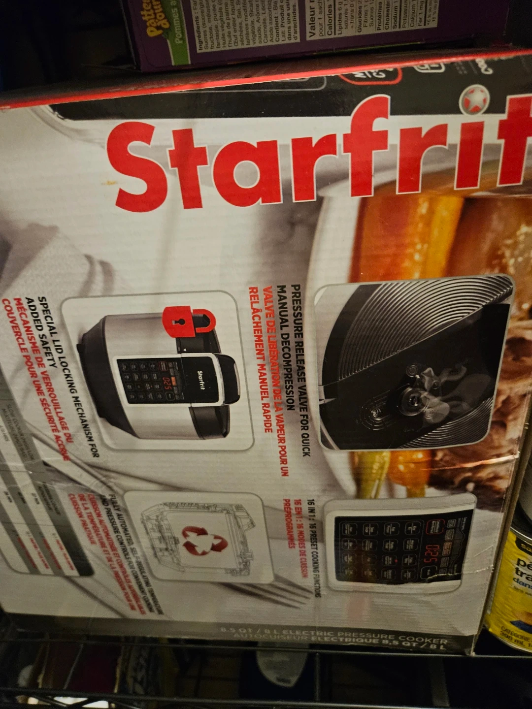 Selling a Starfrit 8.5 QT electric pressure cooker. It features a pressure release valve for quick manual decompression and a special lid locking mechanism for added safety. It is an electric pressure cooker. Only used 2 times just not my thing. Tossing in a vegetable steamer as well.