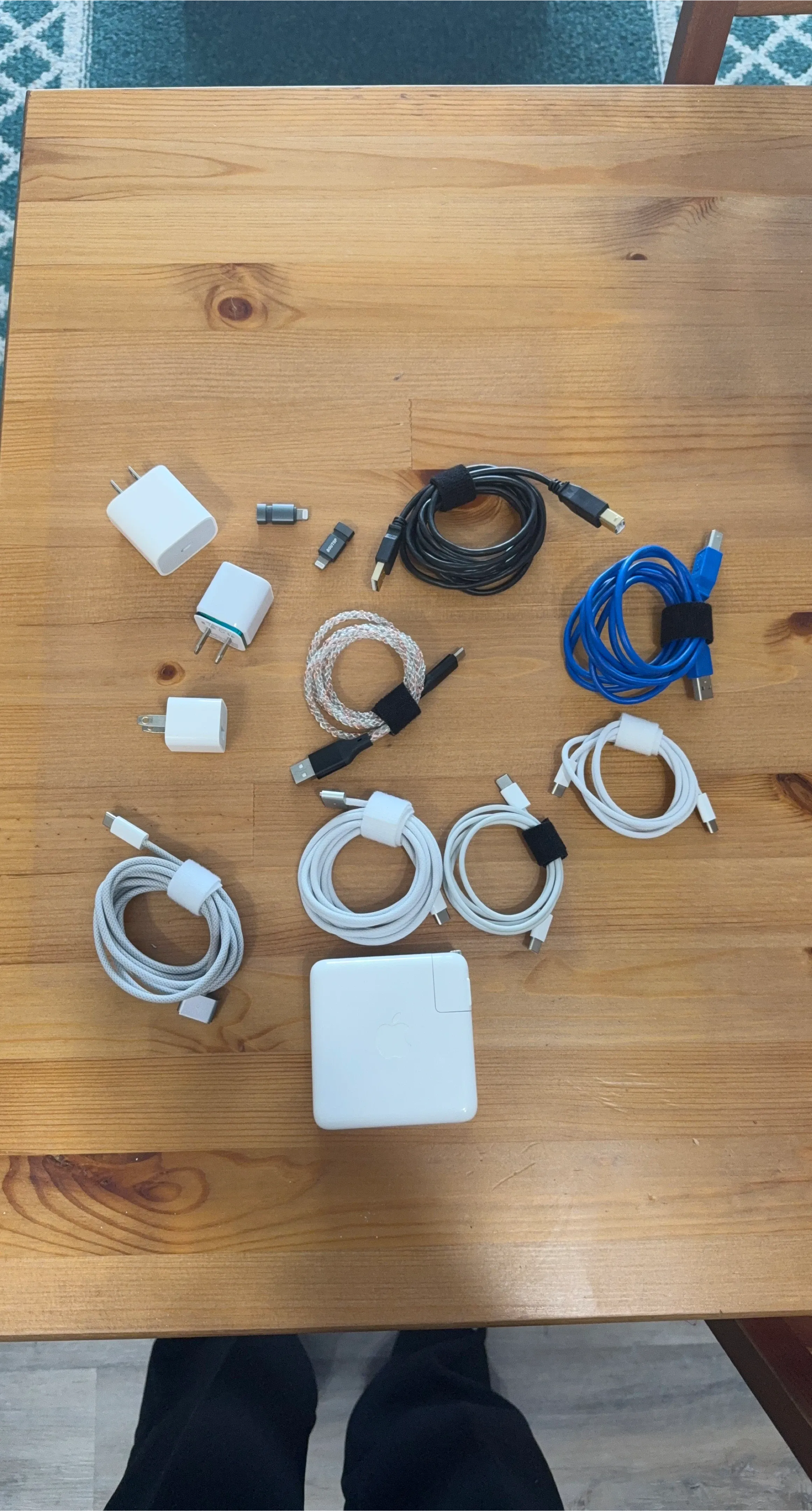 A collection of Apple USB-C power bricks, cables and other miscellaneous cables/adapters. Includes 2 white USB-C power bricks (one for a MacBook) and 2 white USB-A power bricks, 2 new generation macbook pro charging cables, a braided light-up USB-C to USB-A cable, 2 double USB-C cables, 2 USB-C to lightning dongles, and 2 blue and black USB-B to USB-A cables. All come with Velcro cable ties.