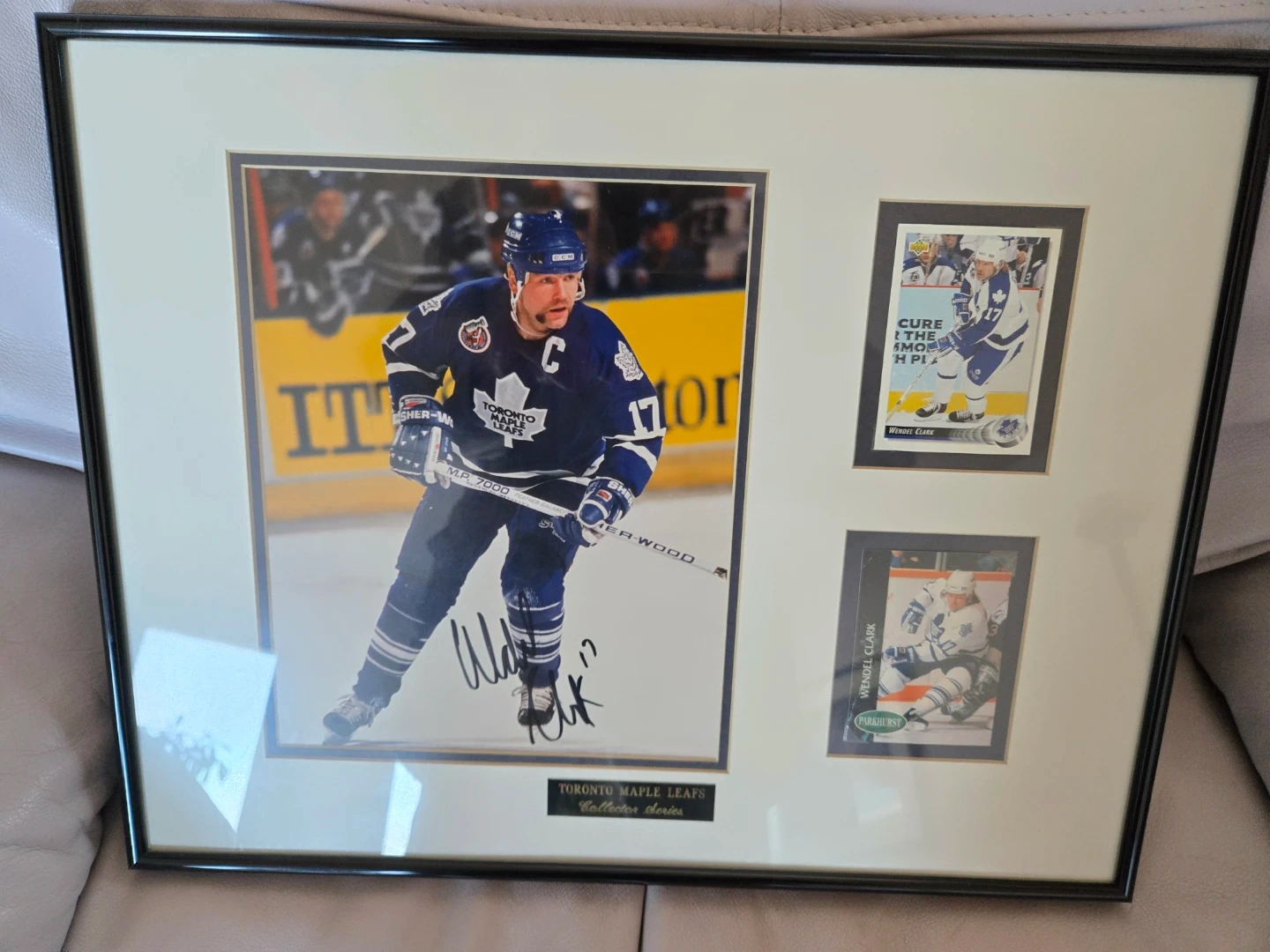 Authentic, signed and certified 8"Γ10" photo, from the Toronto Maple Leafs "Collector Series". Includes two hockey cards (Upper Deck and Parkhurst), double-matted and framed in 14.5"Γ18.5" frame. Certificate of Authenticity included.