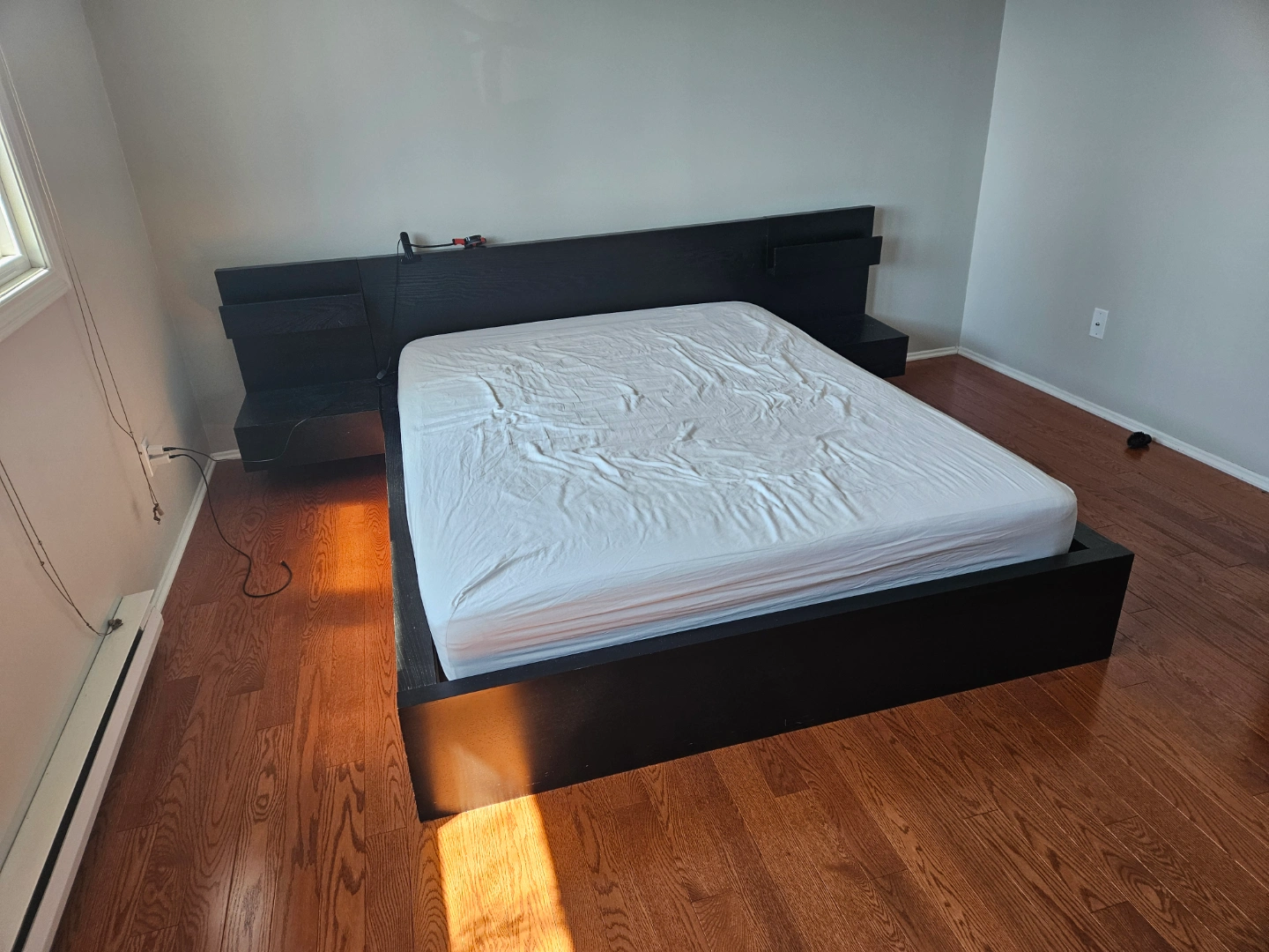 Black platform bed frame. Includes two built-in nightstands. Queen size. Minimalist design. Good condition.