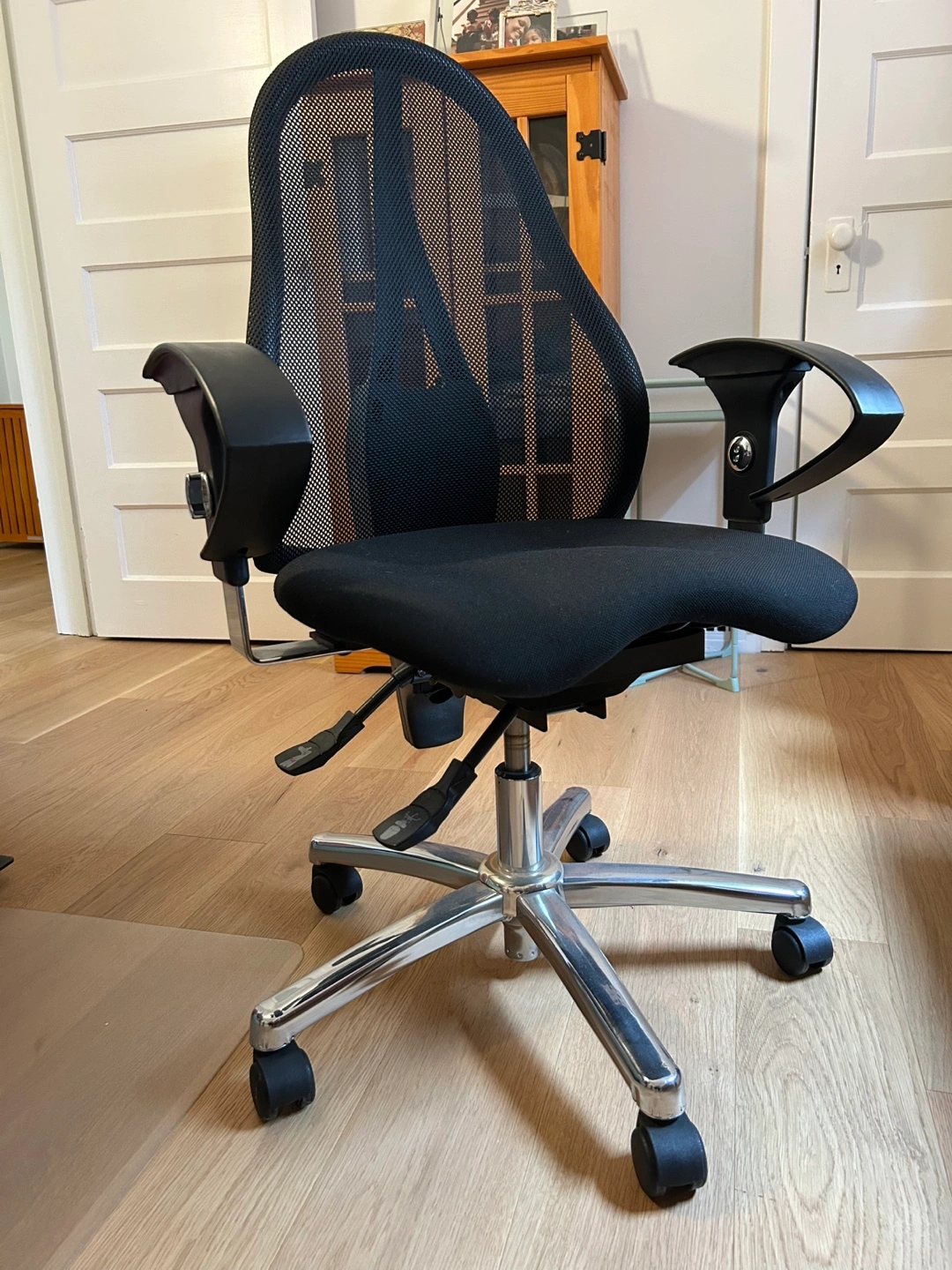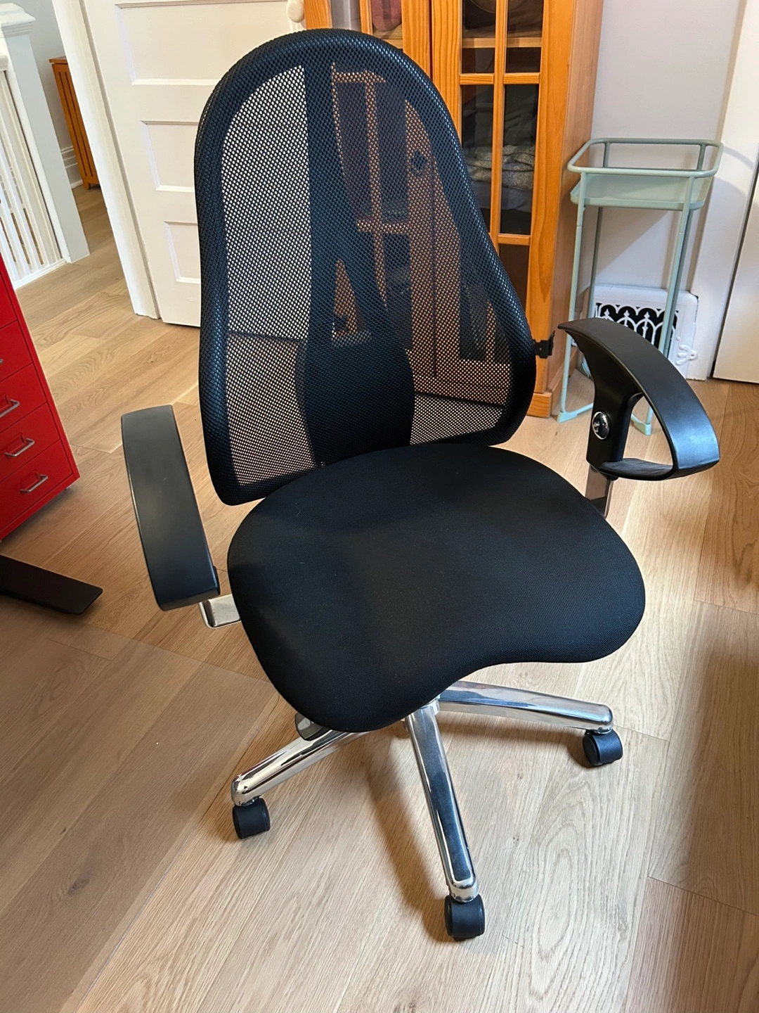 Comfortable office chair. Mesh back and padded seat. Adjustable height and armrests. Chrome base and five caster wheels. Great for home or office use.