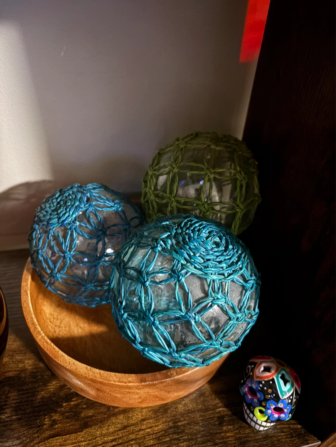 These decorative glass buoys are wrapped in a woven cord netting. They come in blue, green, and brown tones. These would make a charming addition to a nautical-themed decor!