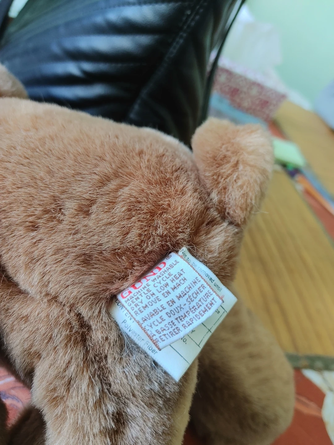 This is a classic brown teddy bear plush toy from GUND 1983 It features a red ribbon around its neck and a GUND tag. The material is soft polyester fiber, and it's machine washable. Surface wash, remove toys before washing. Air dry or low heat.