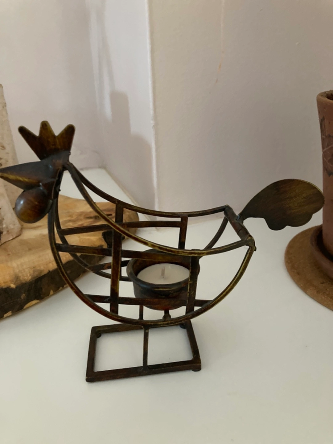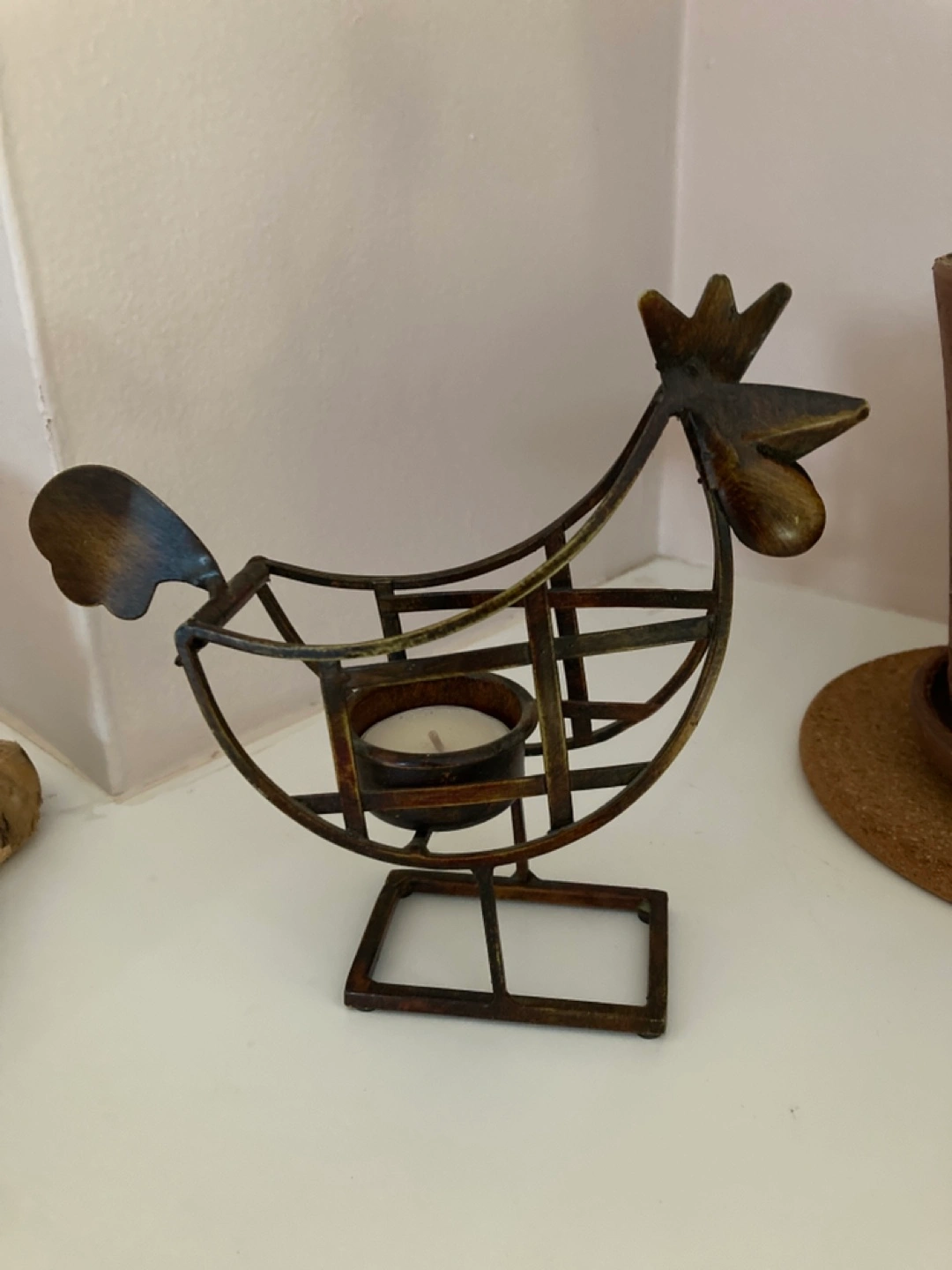Metal rooster candle holder. Holds a tea light. Rustic design. Great for home décor.