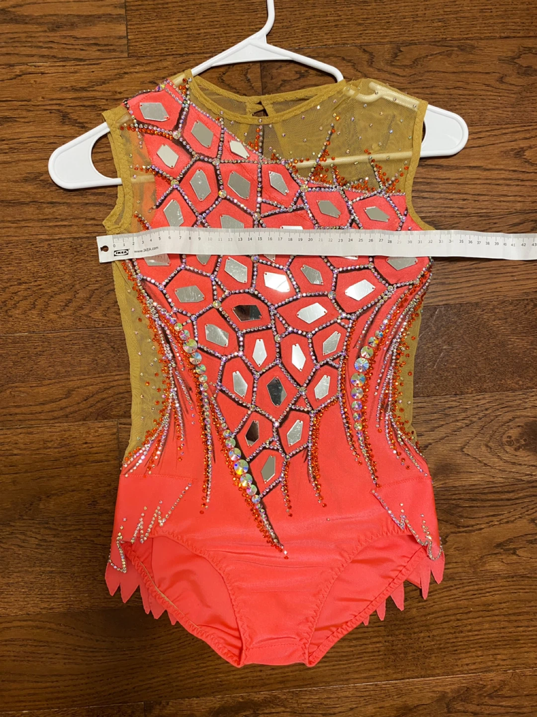 Selling a vibrant orange and gold gymnastics leotard. It features a unique design with mirror accents and bead embellishments. It's in great shape and ready for its next performance!