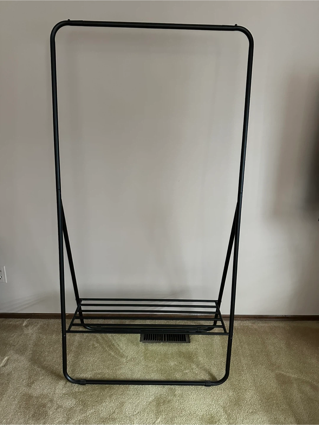 Simple black metal garment rack, perfect for extra storage in your closet or bedroom. Sturdy and in great condition!