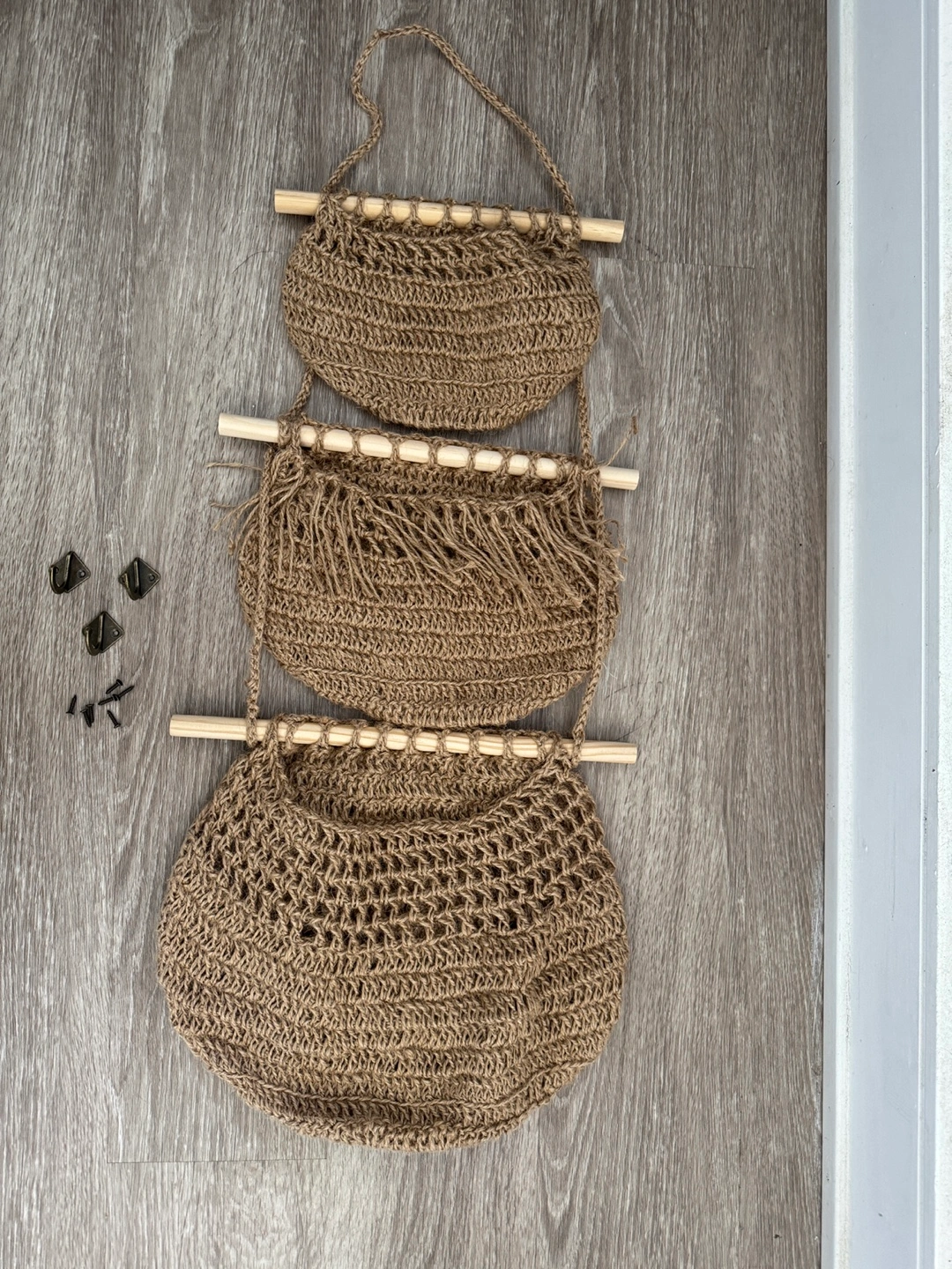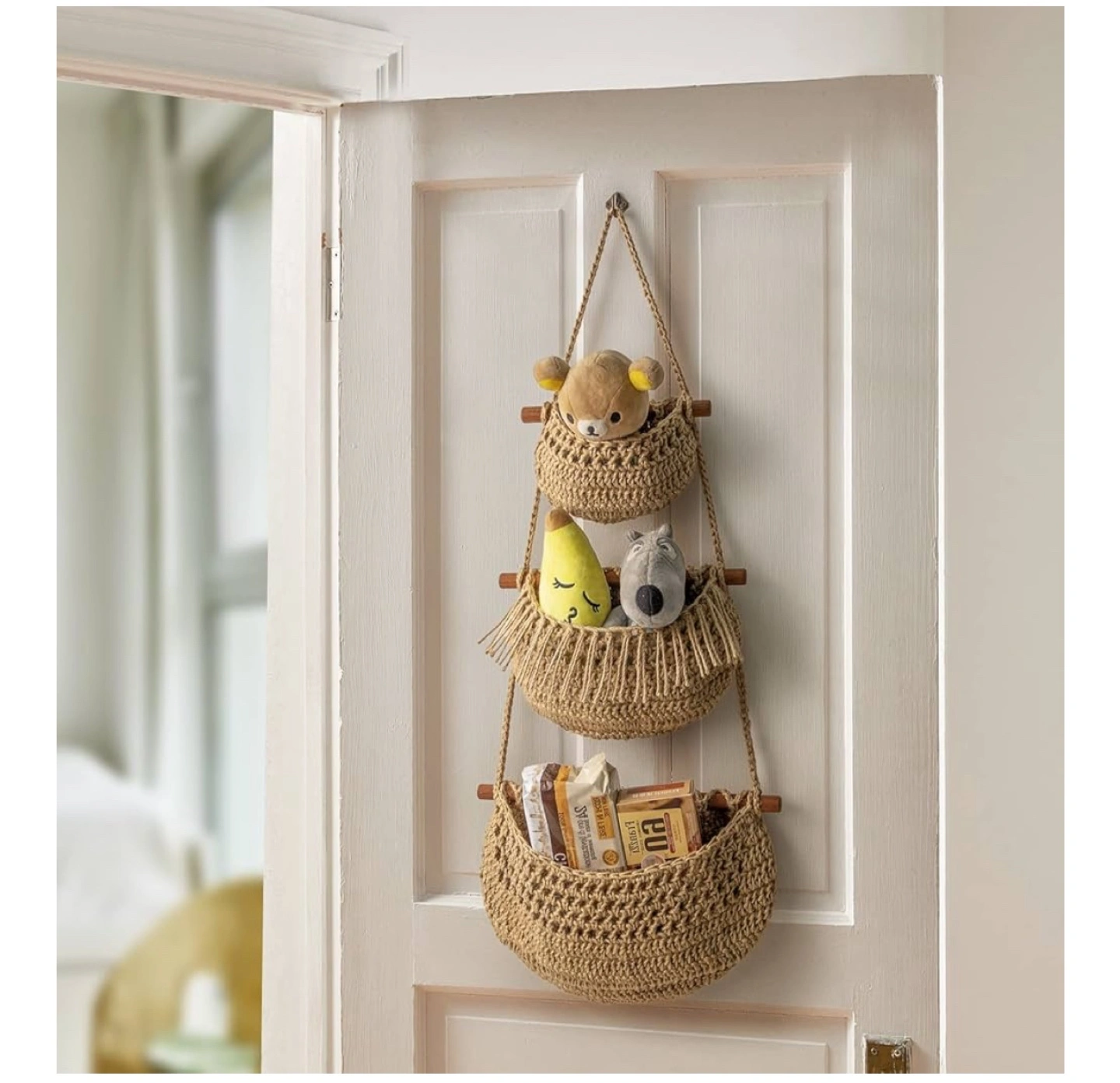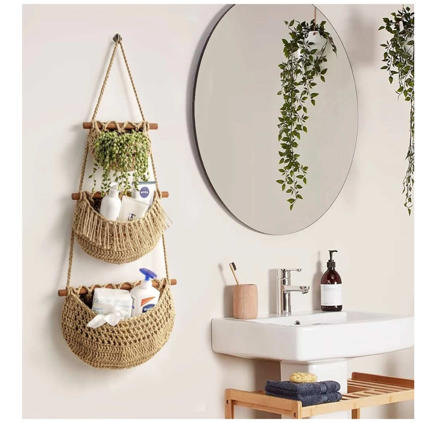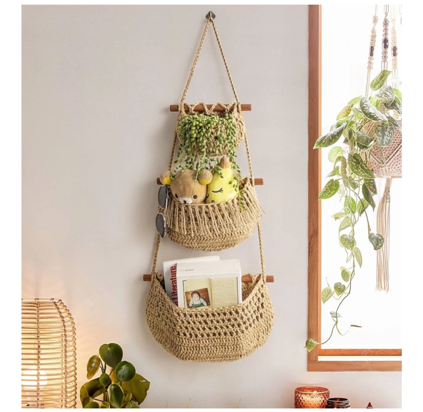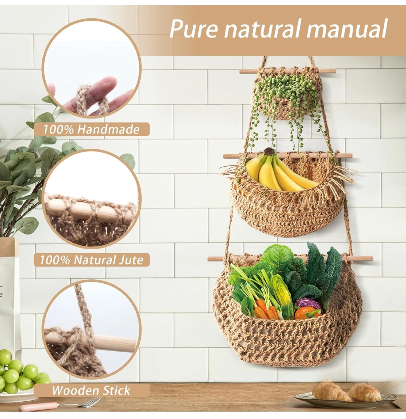 These handmade jute hanging storage baskets are perfect for adding a touch of natural charm to any room! They're made from 100% natural jute and feature wooden sticks for support. Great for organizing toiletries in the bathroom, toys in a kids' room, or even fruits and veggies in the kitchen