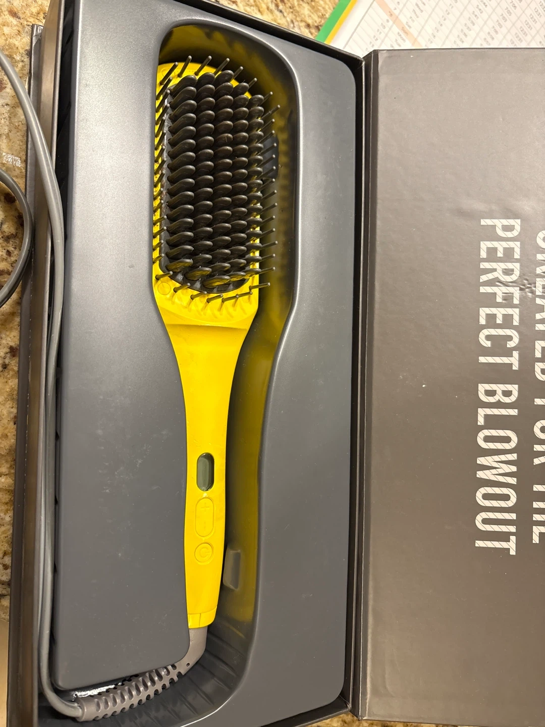 The Drybar The Brush Crush heated straightening brush. It's yellow and features a digital display showing 450°F. Includes original packaging. Retails for $181