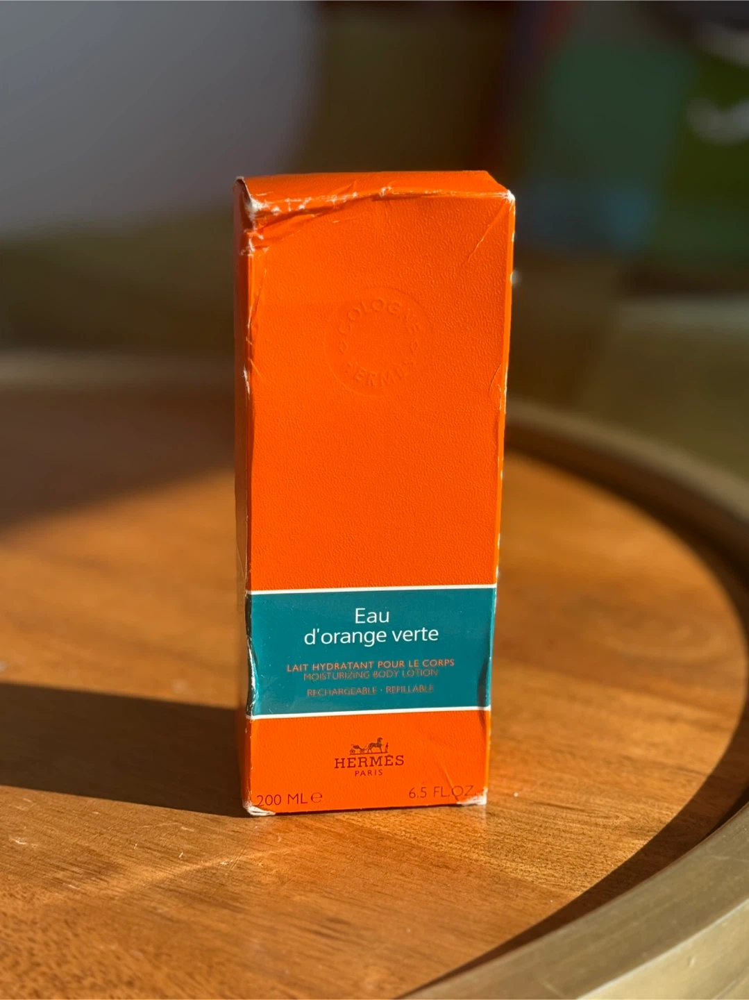 This is Hermès Eau d'Orange Verte moisturizing body lotion. It's refillable. Includes original box. 200ml / 6.5 fl oz. Box is a bit smooshed but lotion is unopened.