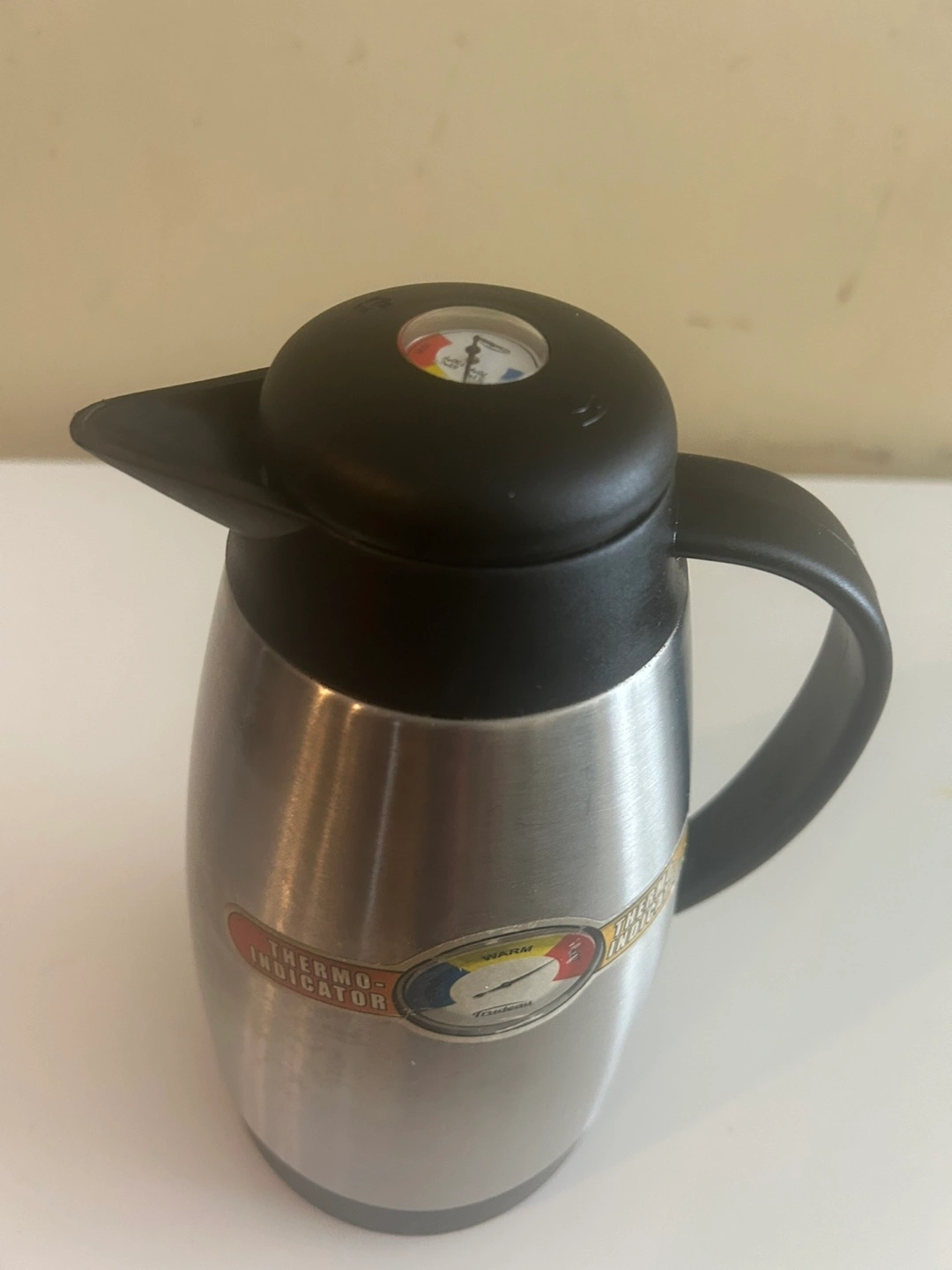 This is a Thermo Indicator carafe! It's in good condition and ready to keep your beverages warm. It features a thermo-indicator to show you how warm your drink is.