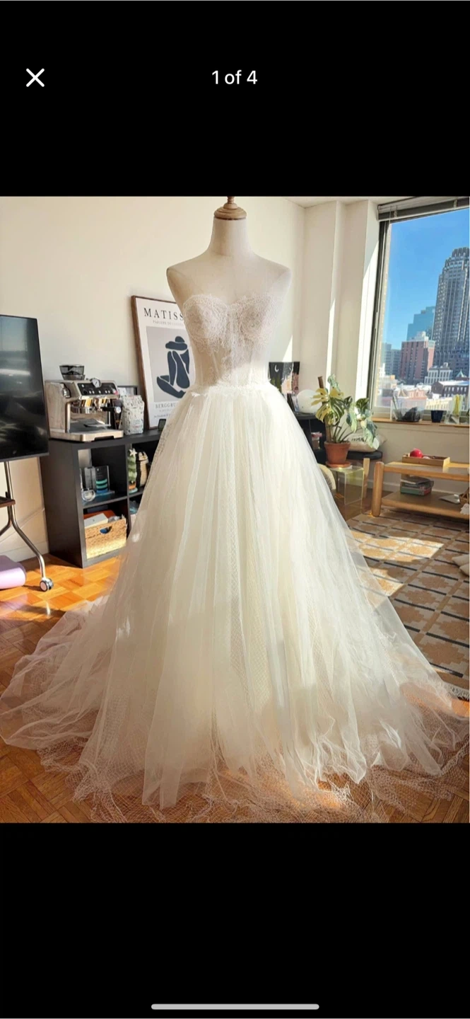 Beautiful white strapless wedding dress with a lace corset bodice. It features a full tulle skirt with intricate lace detailing on the hem. The back has a lace-up corset closure for a customizable fit. Perfect for a wedding day!