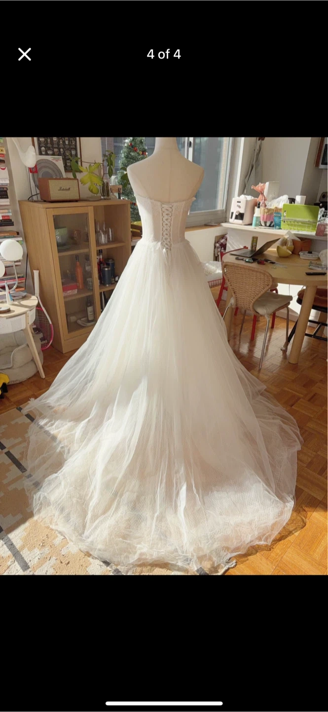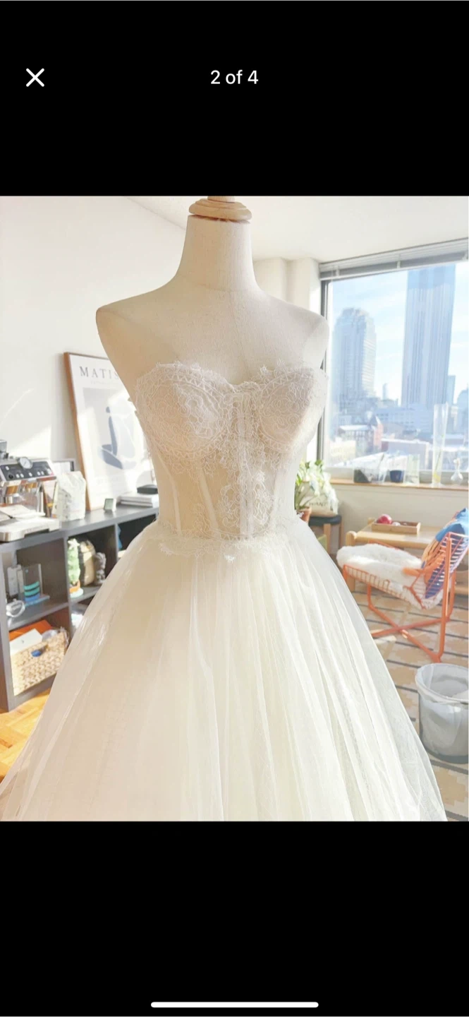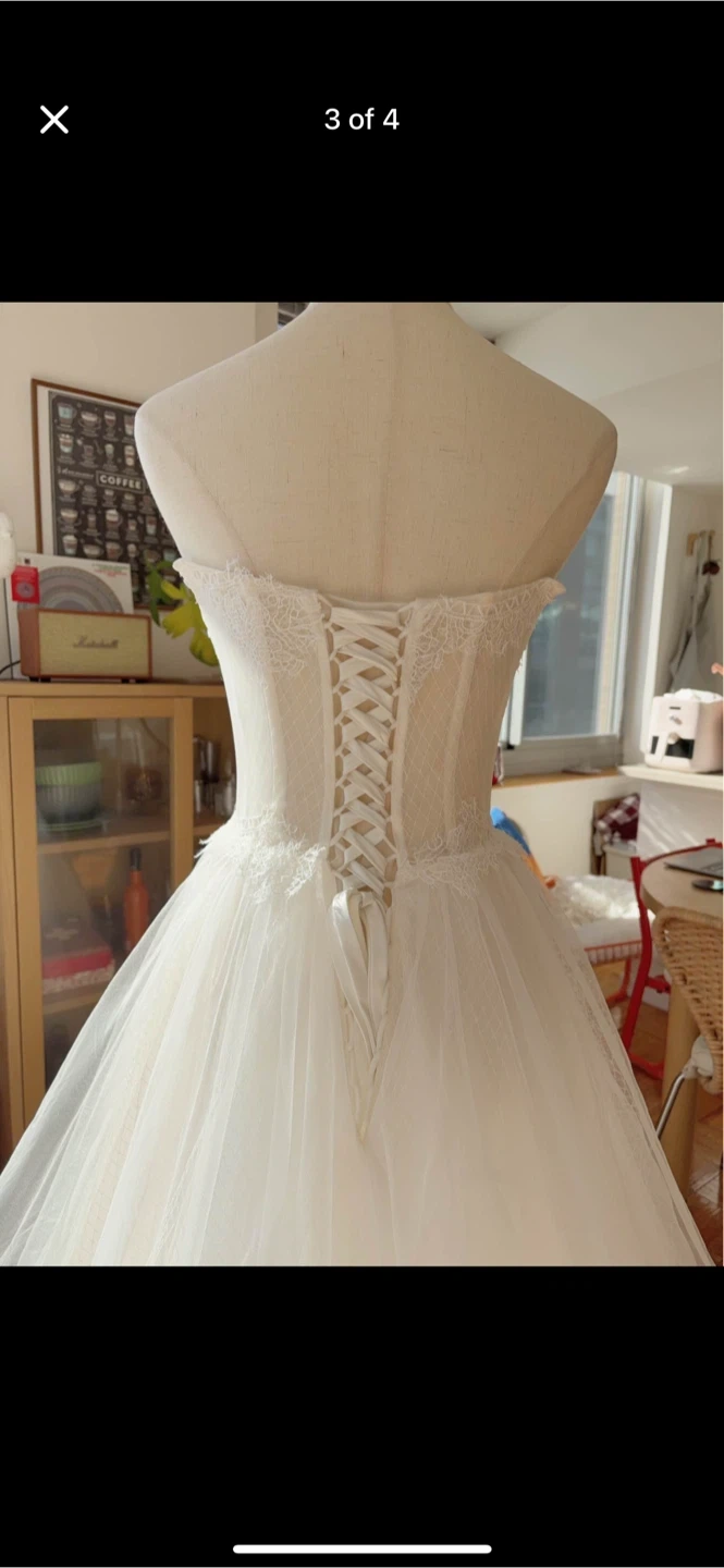 Beautiful white strapless wedding dress with a lace corset bodice. It features a full tulle skirt with intricate lace detailing on the hem. The back has a lace-up corset closure for a customizable fit. Perfect for a wedding day!