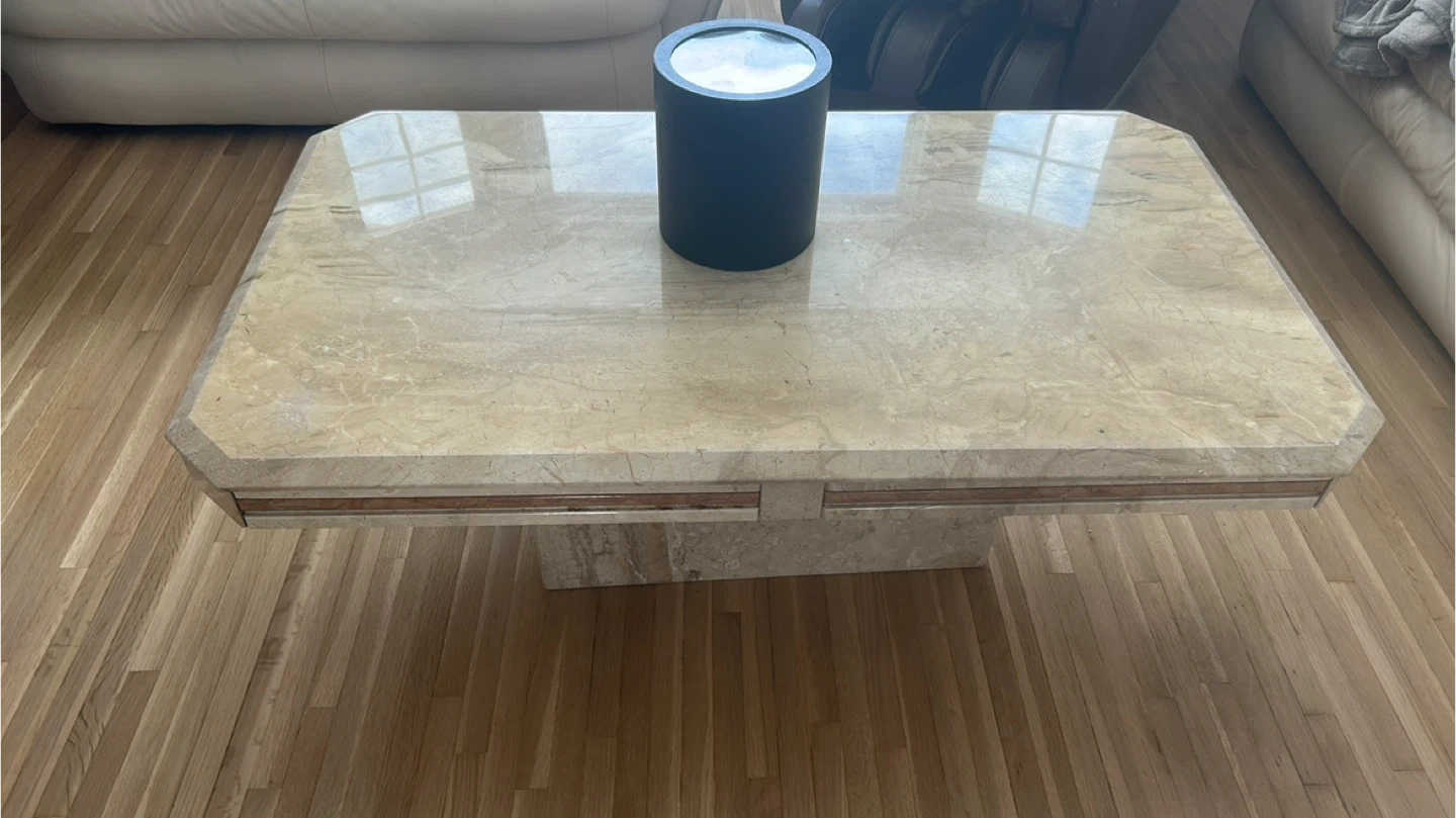 This travertine coffee table features a glossy marble-like top with a unique pedestal base. It has a distinctive inlaid band around the apron. Dimensions are approximately 48" W x 24" D x 18" H. This piece offers a substantial look for a living area.