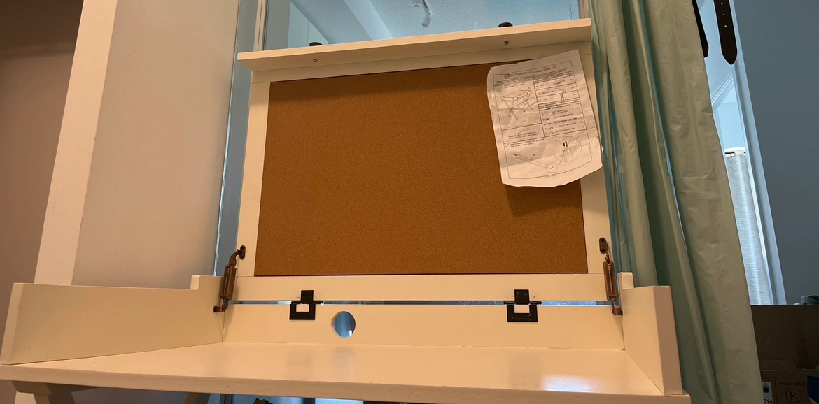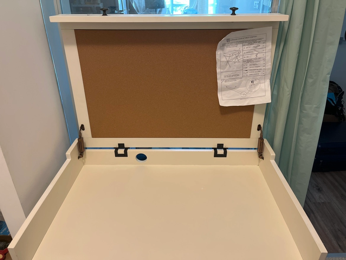 The Kennedy flip-top desk is a unique desk that provides a place to store and use your laptop. This desk also features a corkboard so that you can keep your notes and reminders handy. When you need a writing surface or would just like to keep your laptop safely out of sight the desk can be used with the top compartment closed. This versatile, casually styled desk is the perfect addition to a living room, office, or bedroom.