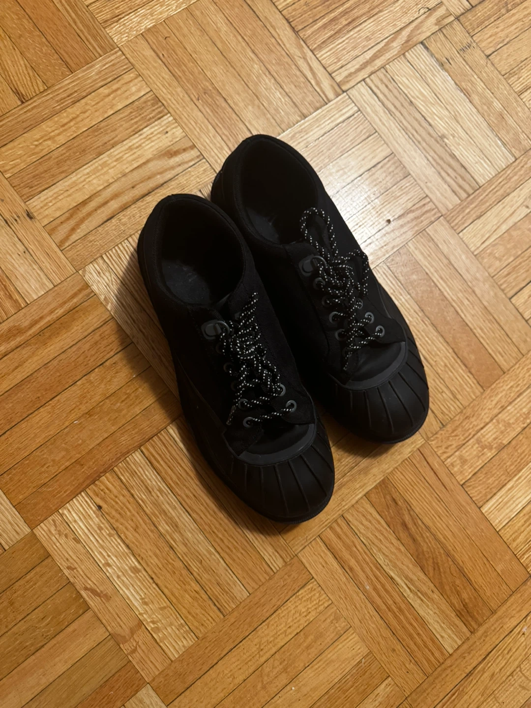 Black sneakers. They feature a durable rubber toe cap and a rugged outsole. The reflective laces add visibility for evening strolls.