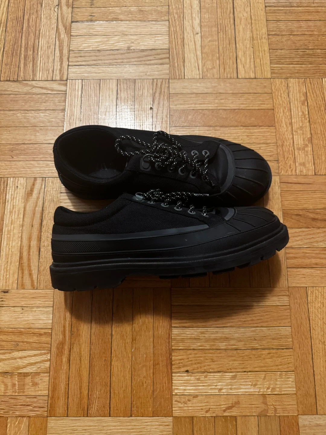 Black sneakers. They feature a durable rubber toe cap and a rugged outsole. The reflective laces add visibility for evening strolls.