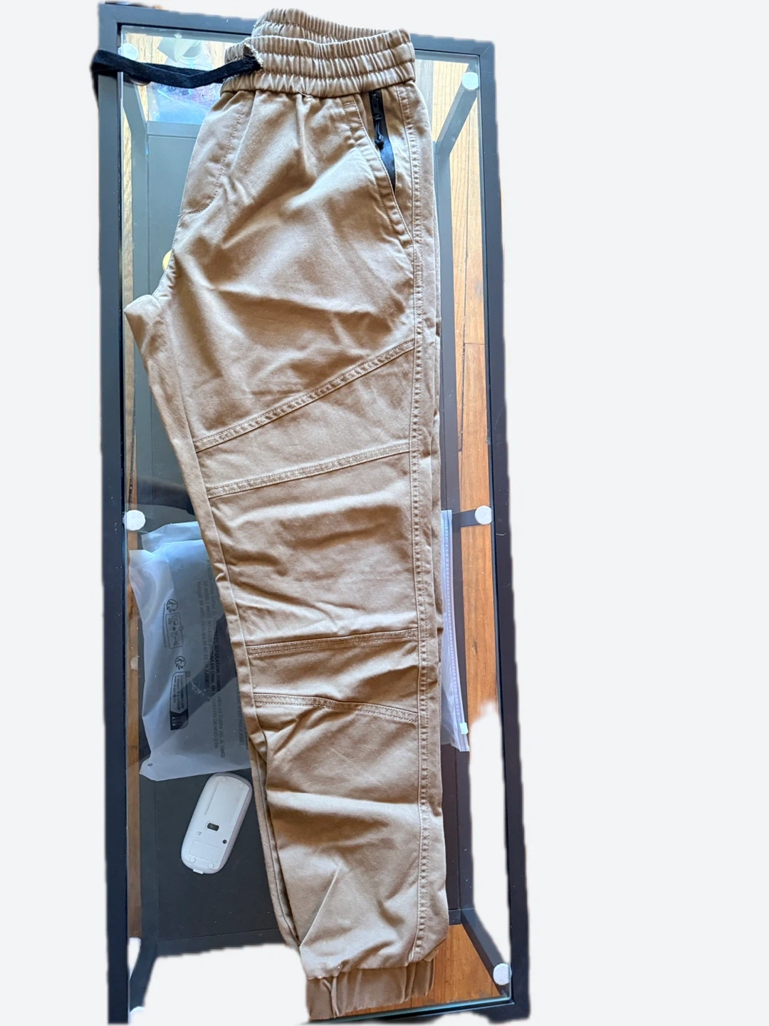 Comfortable men's tan jogger pants. Features a drawstring elastic waistband and zippered pockets. Made with a durable cotton blend fabric.