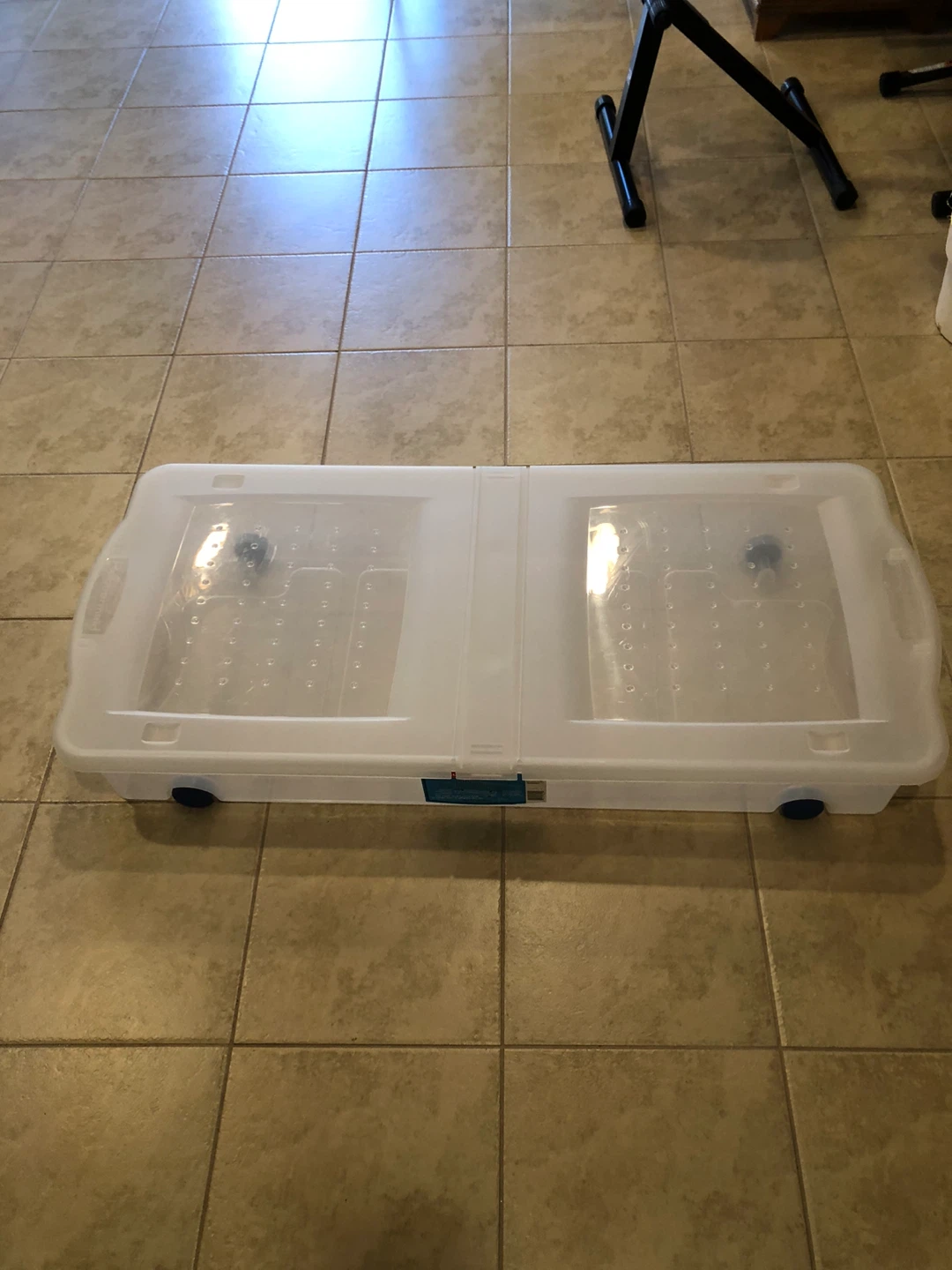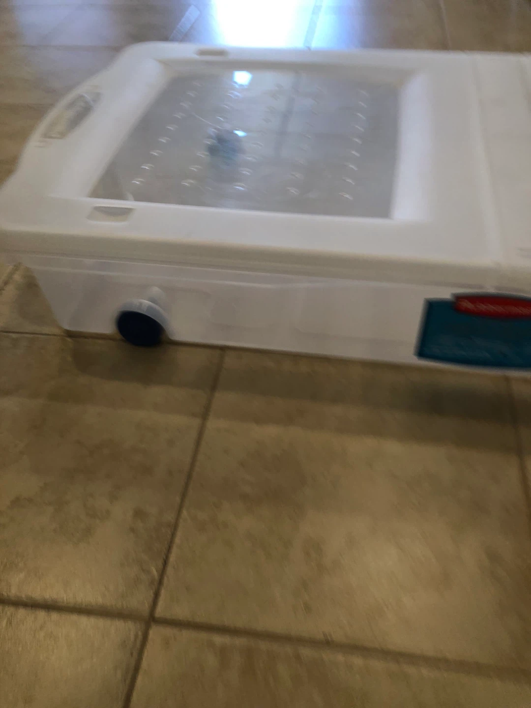 Selling a clear Rubbermaid wheeled underbed storage box. It's great for storing things under your bed and keeping them organized!