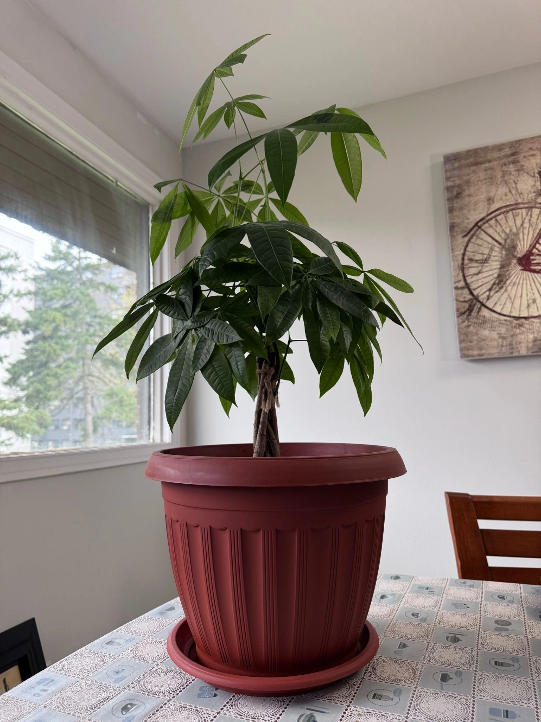 Small money tree plant. Healthy and in a terracotta-coloured plastic pot with saucer. Great addition to your home.