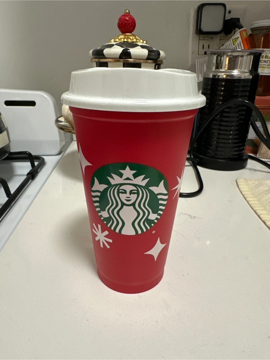 This is a red Starbucks tumbler with a white lid. It features the classic Starbucks logo and festive star accents. It's perfect for enjoying your favorite hot or cold beverages on the go!