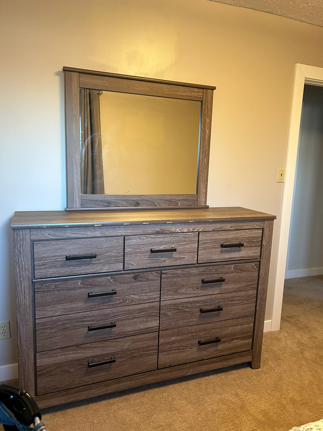 30Made of engineered wood and decorative laminate Warm gray vintage finish with white wax effect over replicated oak grain Pewter-tone hardware 7 smooth-operating drawers Dresser has markings as seen in photo during the process of a move, other than that was brand new. *OBO.