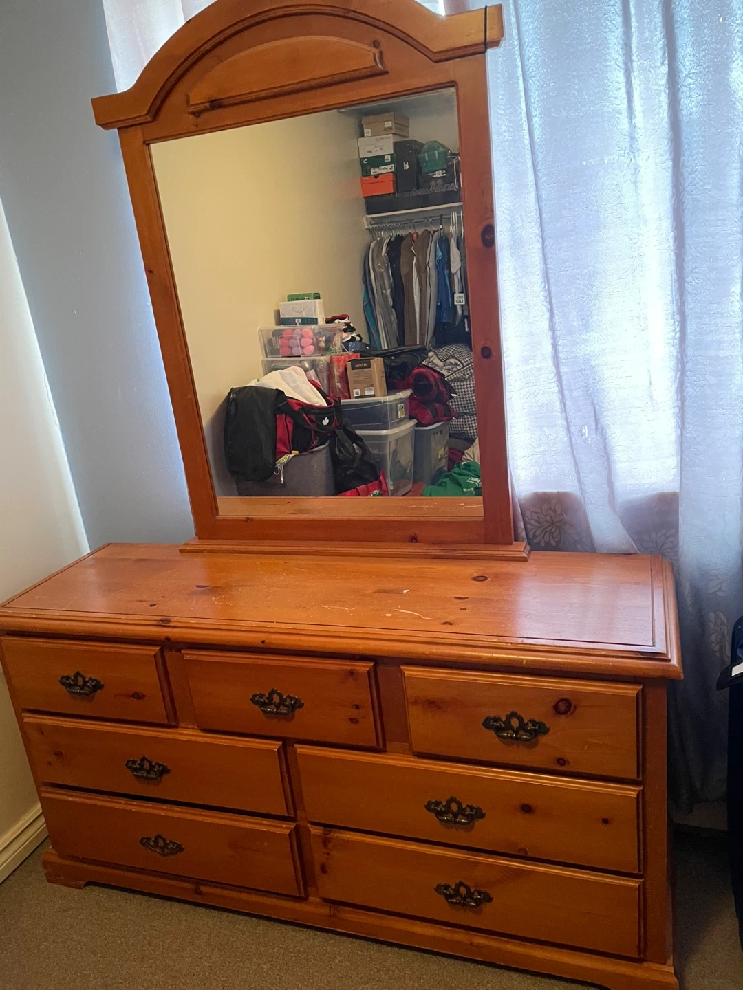 A classic wooden dresser with seven drawers and an attached mirror. It's made of solid wood with ornate drawer pulls. Perfect for storing clothes or linens in a bedroom.