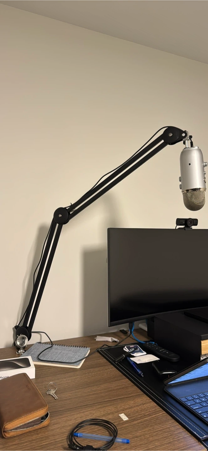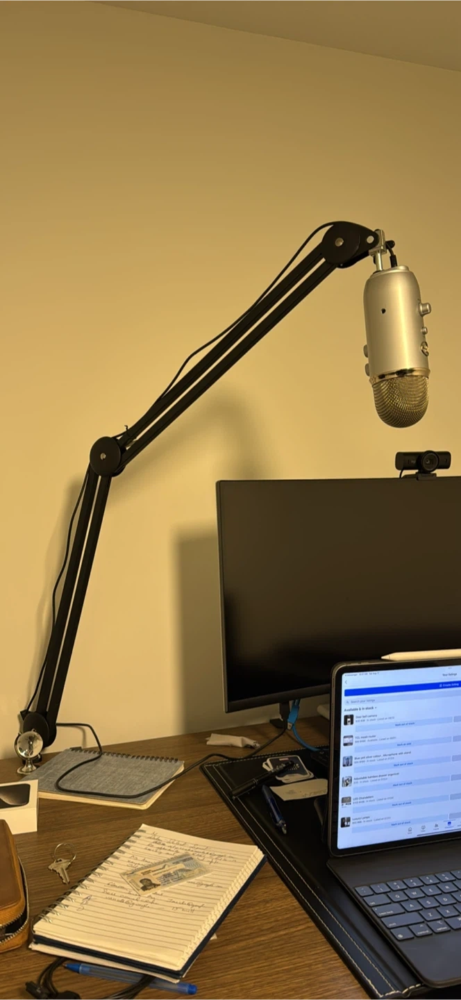 Selling a Blue Yeti USB microphone in great condition! It comes with a boom arm, which is super handy for positioning it just right. The microphone is perfect for recording podcasts, voice-overs, or even just for better sound during video calls. Includes the original box!