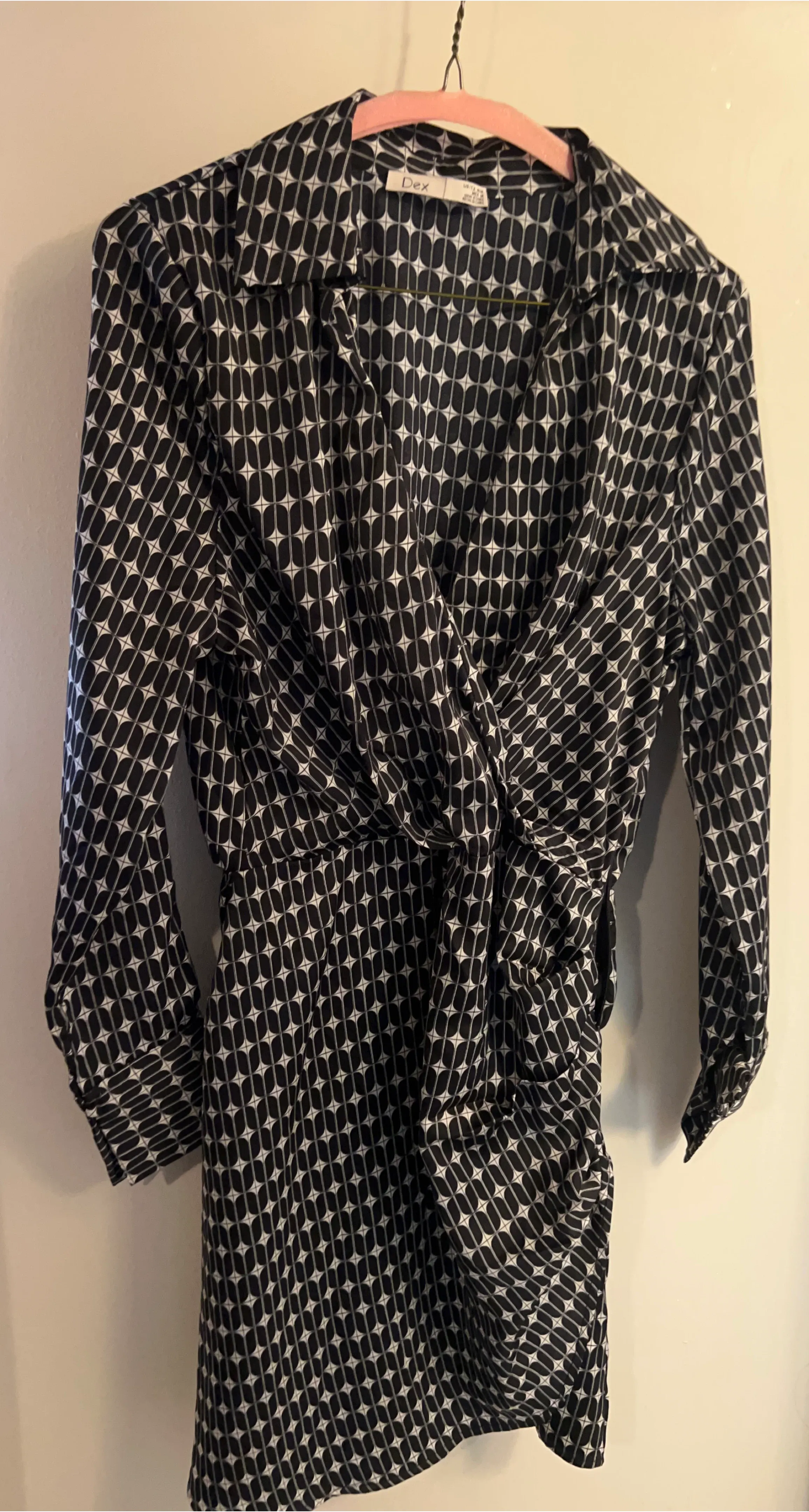 This Dex dress features a black and white geometric pattern. It's a wrap style with long sleeves. The material feels like a polyester blend.
