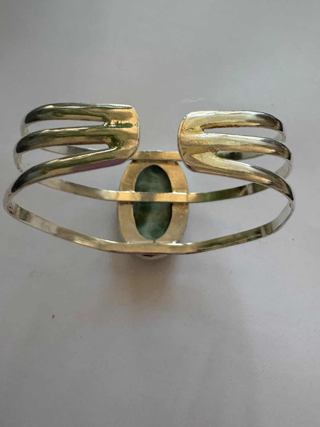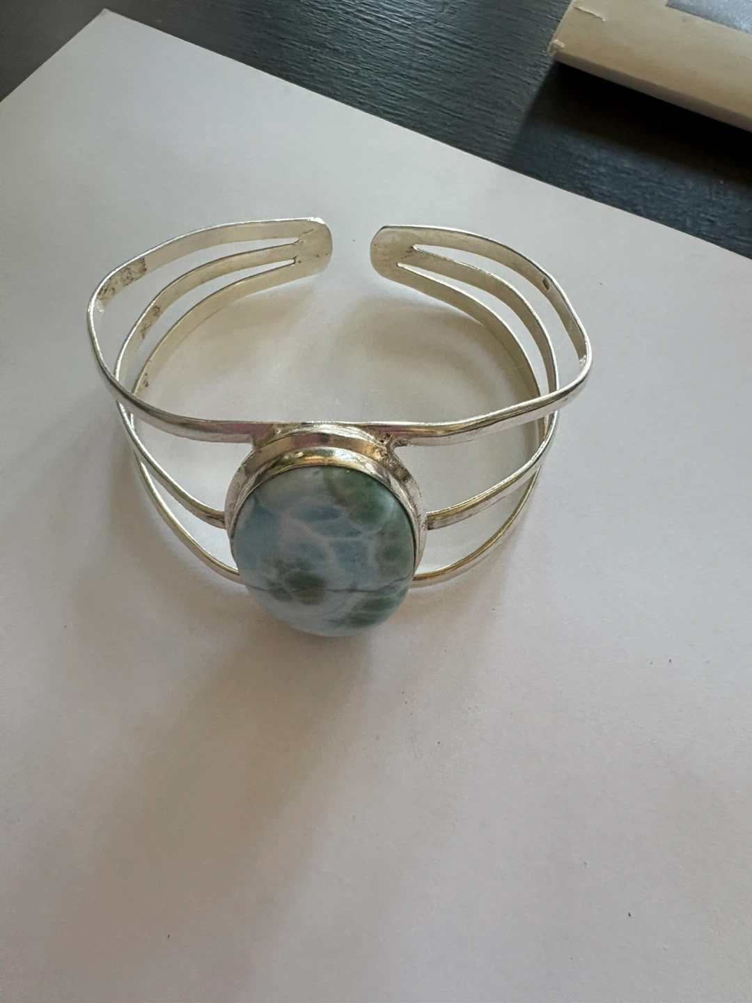 Sterling silver cuff bracelet with a large oval Larimar stone. It's a bypass style with three metal bands forming the bracelet. The stone has beautiful blue and white marbling.