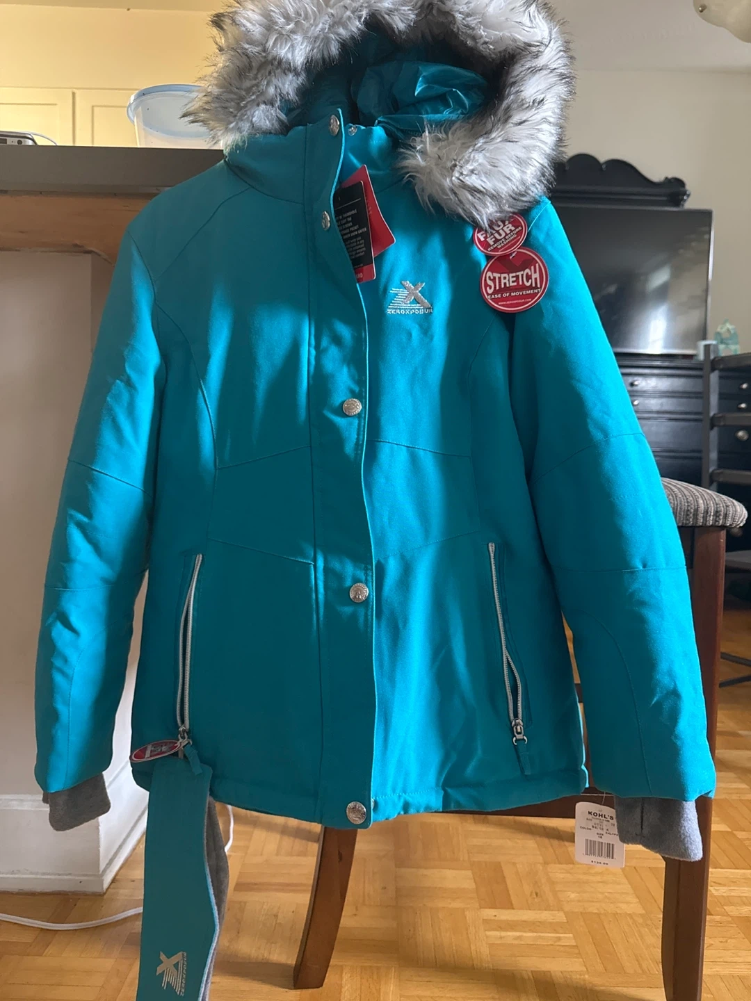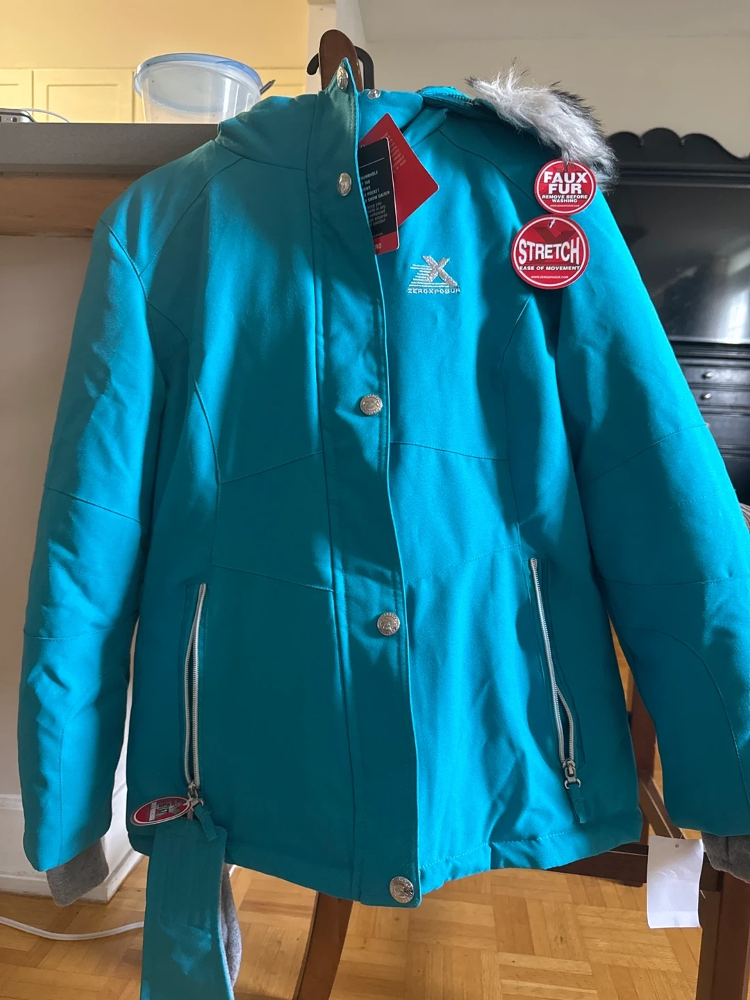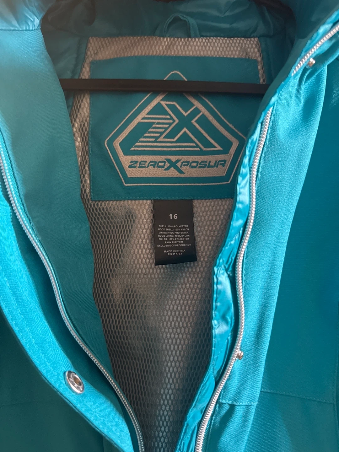Selling a ZeroXposur winter jacket in size 16. It's a lovely teal colour and features a faux fur trim on the hood. The jacket is made with a stretch material for ease of movement. It's perfect for keeping warm during the colder months!